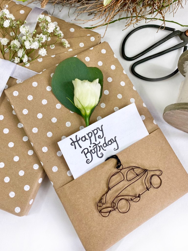 Hier verwende ich die Blanco Seite. So kann ich die Geburtstagskarte gleich in das Geschenk einstecken und mit frischen Blumen verzieren. Im Bastelladen habe ich das süsse Auto aus Draht entdeckt und mit einem dicken Faden am Paket befestigt. Oh ja, das Drahtauto hat etwas mit dem Inhalt zu tun – doch mehr wird zum Geschenk nicht verraten!!