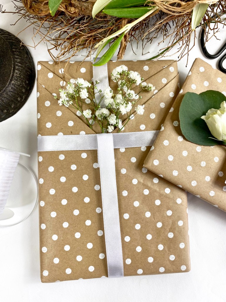 Für meine Päckchen habe ich mir Kraftpapier, das mit Tupfen verziert ist ausgesucht und beim ersten Geschenk die Vorderseite im Kimono Style verpackt ist. Dazu wird das Papier passend zur Grösse zugeschnitten und mittig auf den Bogen platziert das der obere Teil zu zwei drittel bedeckt ist. Dann wird links und rechts das Papier eingeschlagen, dass auf beiden Seiten je zwei spitze Ecken entstehen.