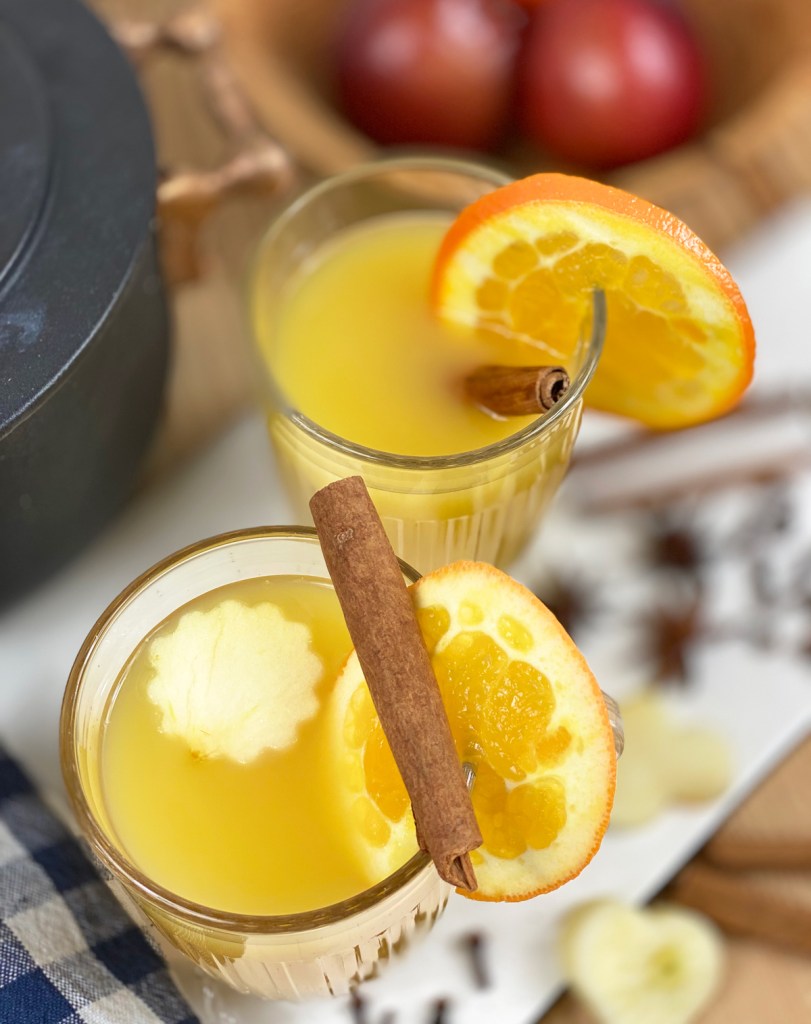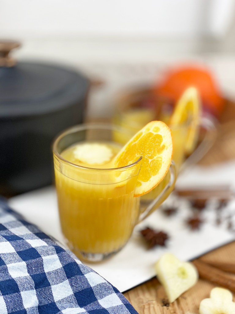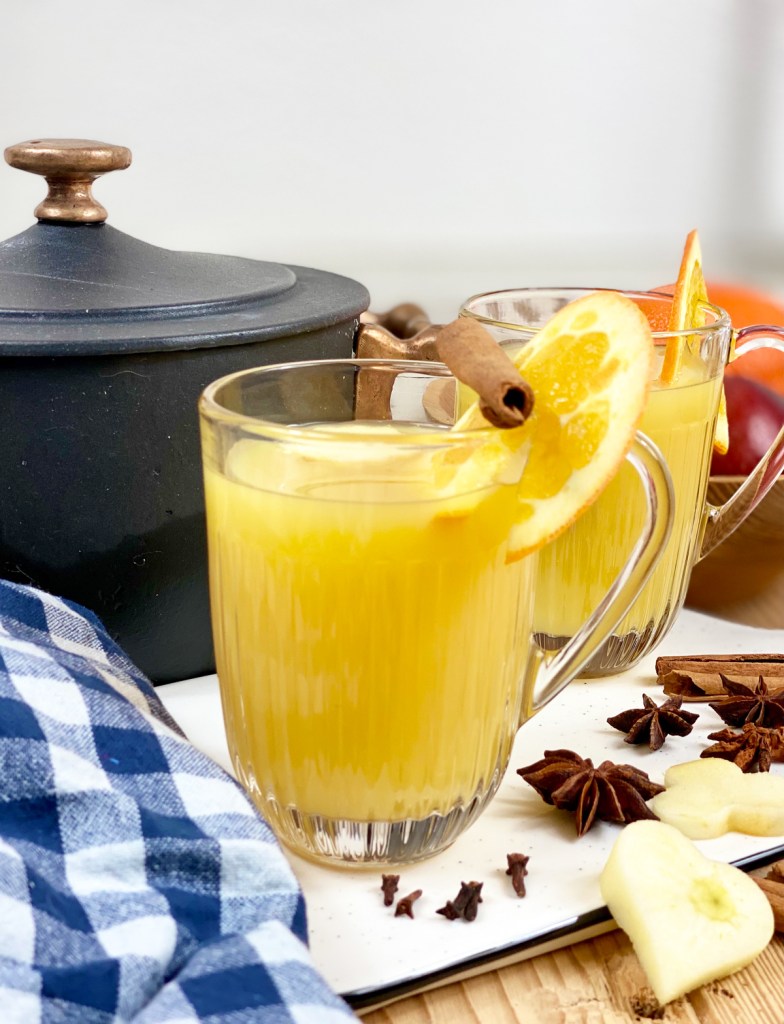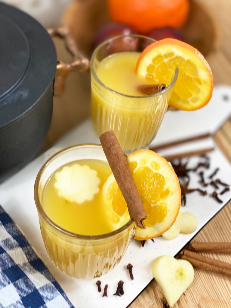 Den Apfelsaft in einen Topf geben. Die Orangen schälen, auspressen und mit den Orangenzesten in den Topf geben. Ingwer in dünne Scheiben schneiden und zusammen mit den Gewürzen zum Saft hinzugeben. Bei mittlerer Hitze ca. 20 Minuten erwärmen, dabei darauf achten, dass die Flüssigkeit nicht kocht. Zum Schluss kommt Gin hinzu.