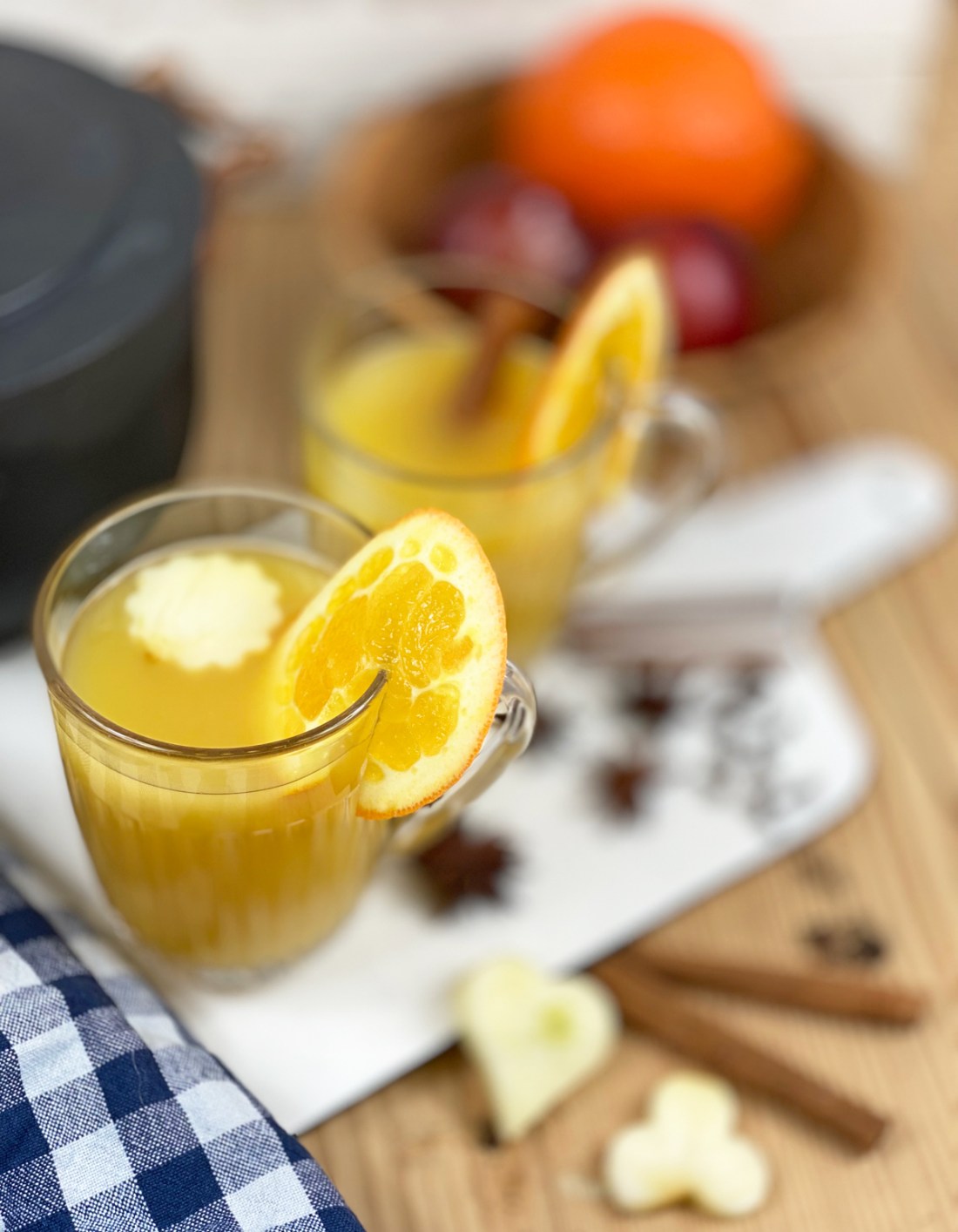 Den Apfelsaft in einen Topf geben. Die Orangen schälen, auspressen und mit den Orangenzesten in den Topf geben. Ingwer in dünne Scheiben schneiden und zusammen mit den Gewürzen zum Saft hinzugeben. Bei mittlerer Hitze ca. 20 Minuten erwärmen, dabei darauf achten, dass die Flüssigkeit nicht kocht. Zum Schluss kommt Gin hinzu.