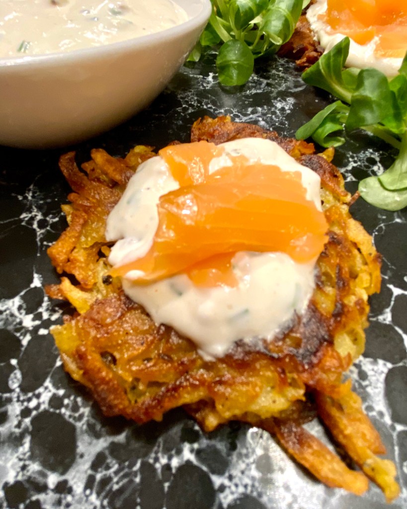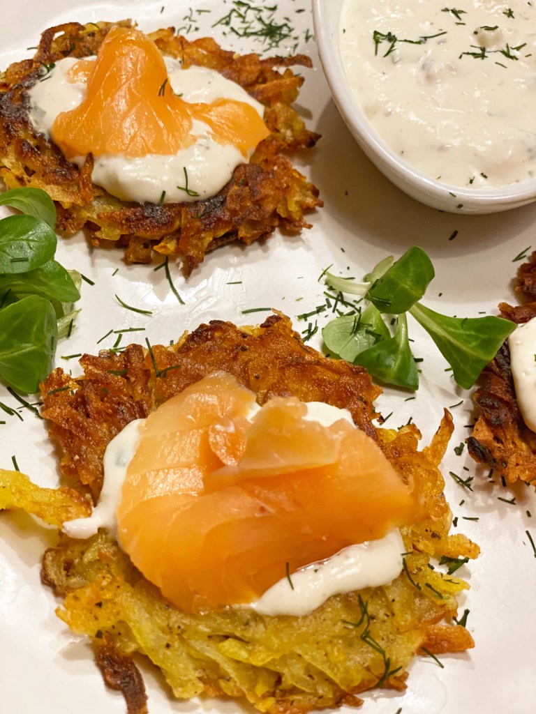 Herzhaft, knusprig und lecker, Kartoffelrösti mit Meerrettich Quark und geräuchertem Lachs, ein tolles Abendessen, das schnell und einfach zubereitet ist. Für die Zubereitung gibt es Meinungsverschiedenheiten, insbesondere bei der Frage ob rohe oder gekochte Kartoffel verwendet werden, mit oder ohne Ei, mit oder ohne Zwiebel. Meist macht man die Rösti in einer grossen Pfanne als einzelner Fladen, doch ich habe mich für einzelne kleine Küchlein entschieden. Es ist leichter die Küchlein in der Pfanne zu wenden. Goldbraun gebraten schmecken Rösti zum Geschnetzelten, zu deftigen Schmorgerichten und zum geräucherten Lachs.