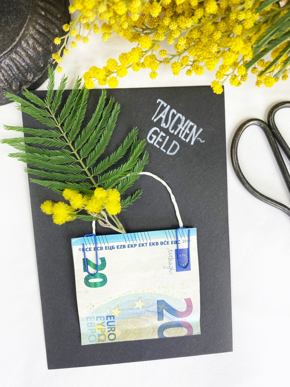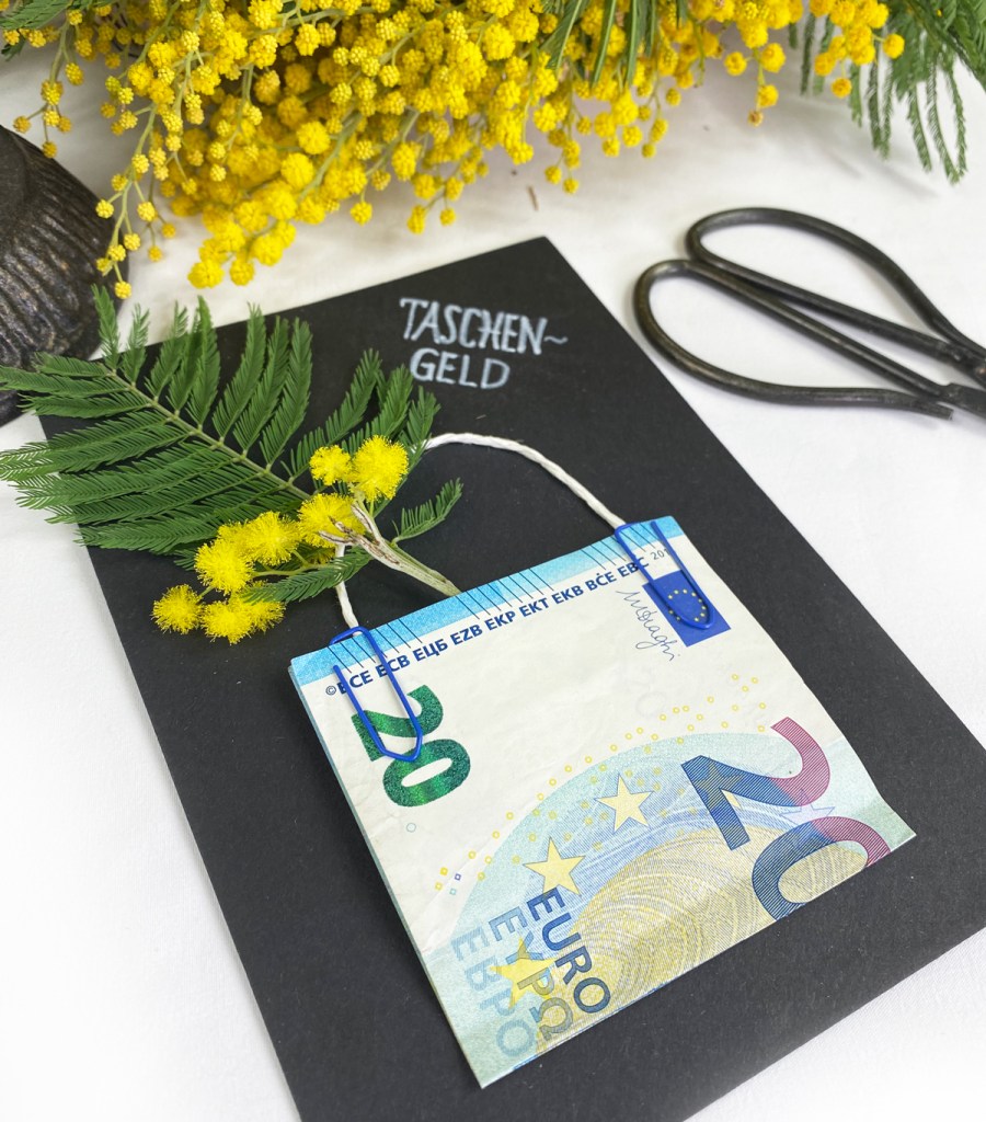 Bei Pinterest fand ich eine hübsche Idee und die originelle DIY Geldgeschenk-Karte ist schnell gebastelt. Bin mir sicher, dass die „Taschengeldkarte“ gut ankommen wird. Dafür benötigt ihr eine Blanco Karte, 2 Büroklammern, 4 Moosgummi und ein Stück Kordel. Zuerst habe ich die Karte beschriftet und den Geldschein mittig gefalzt. Damit sich der Schein gut ablösen lässt habe ich ihn an den 4 Ecken mit je einem Moosgummi befestigt und die Kordel als Taschenhenkel angeklebt. Zwei Büroklammern und wer mag kann die Tasche noch mit ein paar frischen Blümchen verzieren. Bei den vielen Tanten, Omis und Freunden wird sich der Taschenwunsch bald erfüllen lassen.