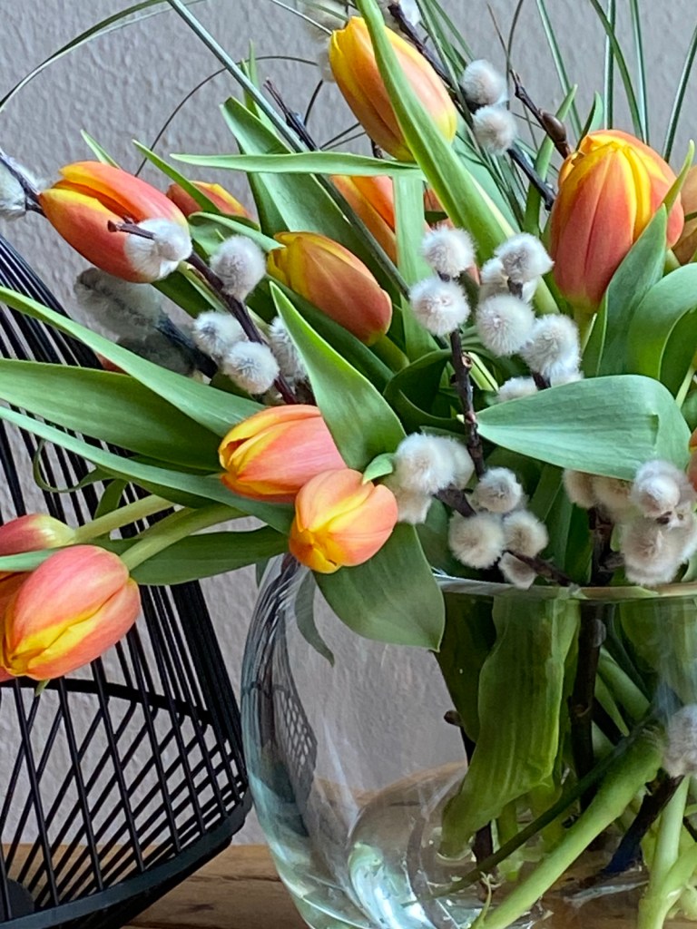 Ob als Strauss, einzeln in der Vase oder auch mit Zwiebel im Topf – Tulpen stehen wie kaum eine andere Blume für den Frühling und sind geradezu perfekt für eine schöne Tischdeko. Ob kunterbunt oder ganz schlicht in weiß, ein Tulpenstrauß darf in dieser Jahreszeit nicht fehlen und sind auch als Mitbringsel immer gerne gesehen. Ein weiterer Grund, warum Tulpen so beliebt sind, es braucht keine floristischen Fähigkeiten, um einen tollen Strauss zu arrangieren. Einfach 10 Tulpen in eine Vase stellen und fertig. Zuerst sehen sie meist noch etwas steif aus, doch mit der Zeit biegen sie sich anmutig in alle Richtungen und bilden einen perfekten Strauss. Mein Lieblings-Beiwerk für Tulpen sind Weidekätzchen, auch Palmkätzchen genannt, mit ihren pelzigen Puscheln, die noch von meiner Osterdeko übrig geblieben sind. Sie geben den Tulpen halt, wenn`s nötig ist.