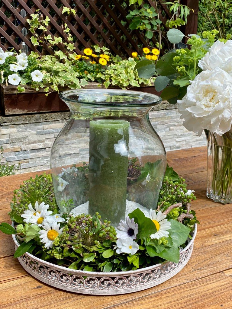 Zum Schluss werden die Blütenkugeln vom Allium, Efeu, Margeriten und Kappkörbchen in den Kranz eingearbeitet und mit Patenthaften befestigt. Die Blumen sind schon nach kurzer Zeit welk und können durch andere Blüten ersetzt werden. Doch auch nur mit Allium sieht der Kranz hübsch aus und ziert nun meinen Terrassentisch.