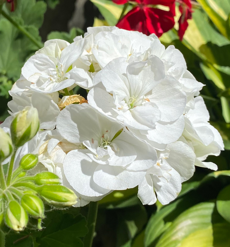 Es sprechen viele Argumente für Geranien als Sommerbepflanzung von Kübeln oder Balkonkästen. Zu einem benötigt die Geranie wenig Pflege, sie vertragen pralle Sonne und hohe Temperaturen ohne gleich zu vertrocknen. Bei langen Regenphasen muss die Geranie geschützt werden, um Grauschimmel zu vermeiden. Wichtig ist die Temperatur des Gießwassers, gerade wenn die Pflanze durch die Sonne stark erhitzt wurde, mögen Geranien kaltes Wasser nicht so gerne. Ich gieße am frühen Morgen und achte, dass das Wasser nie direkt auf Blätter und Blüten gelangt. Das ständige Entfernen der abgeblühten Blüten und verwelkten Blättern ist genauso wichtig, wie das Düngen der Pflanze.
