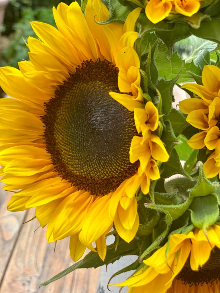 Keine andere Sommerblume stellt die schönste Zeit des Jahres besser dar, als die Sonnenblume und ich verschenke im Sommer sehr gerne Sonnenblumen. Für eine Einladung habe ich vier große Sonnenblumen auf dem Blumenfeld geschnitten, ein schöner Blumengruß der sofort gute Laune verbreitet. Für meinen Esstisch habe ich mir die kleine Sorte ausgesucht, mit Kamilleblumen, grünem Beiwerk und Lagurus zu einem Strauss gebunden. Im Sommer gibt es wahrscheinlich nichts Besseres als ein Sonnenblumen-Arrangement!