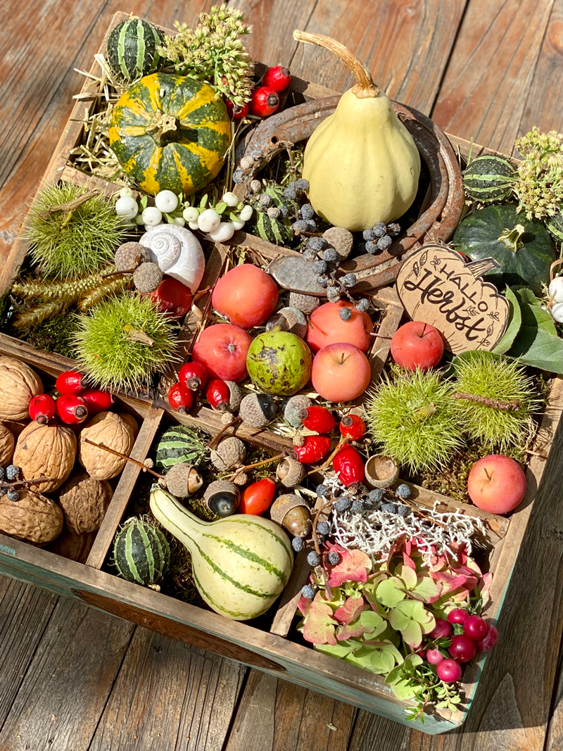 Meinen Setzkasten schmücke ich gerne im Frühjahr mit den ersten Frühblüher und jetzt im Herbst mit allem, was die Natur uns schenkt. Eine bunte Mischung aus Hagebutten, Zieräpfel, Scheinbeeren, Fette Henne, Hortensien, Eicheln und vieles mehr. Einfach mal Danke sagen, das machen wir viel zu selten. Gelegenheit dazu gibt es morgen beim Erntedankfest und im Herbst sagen wir Danke für eine reiche Ernte und erinnern uns daran, wie schön es ist, die guten Gaben und unsere Zeit miteinander zu teilen.