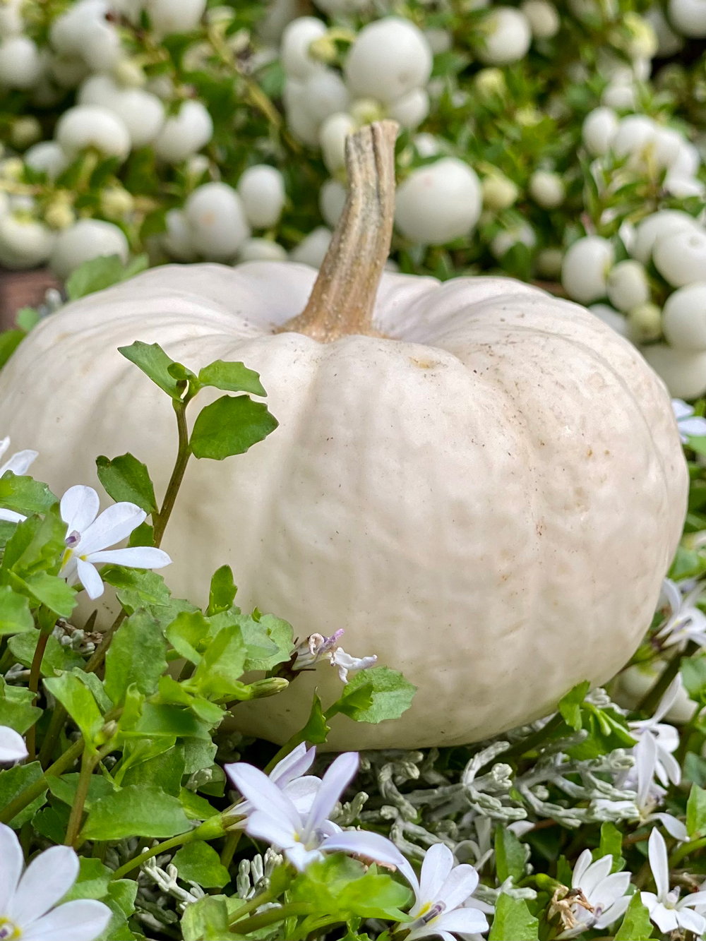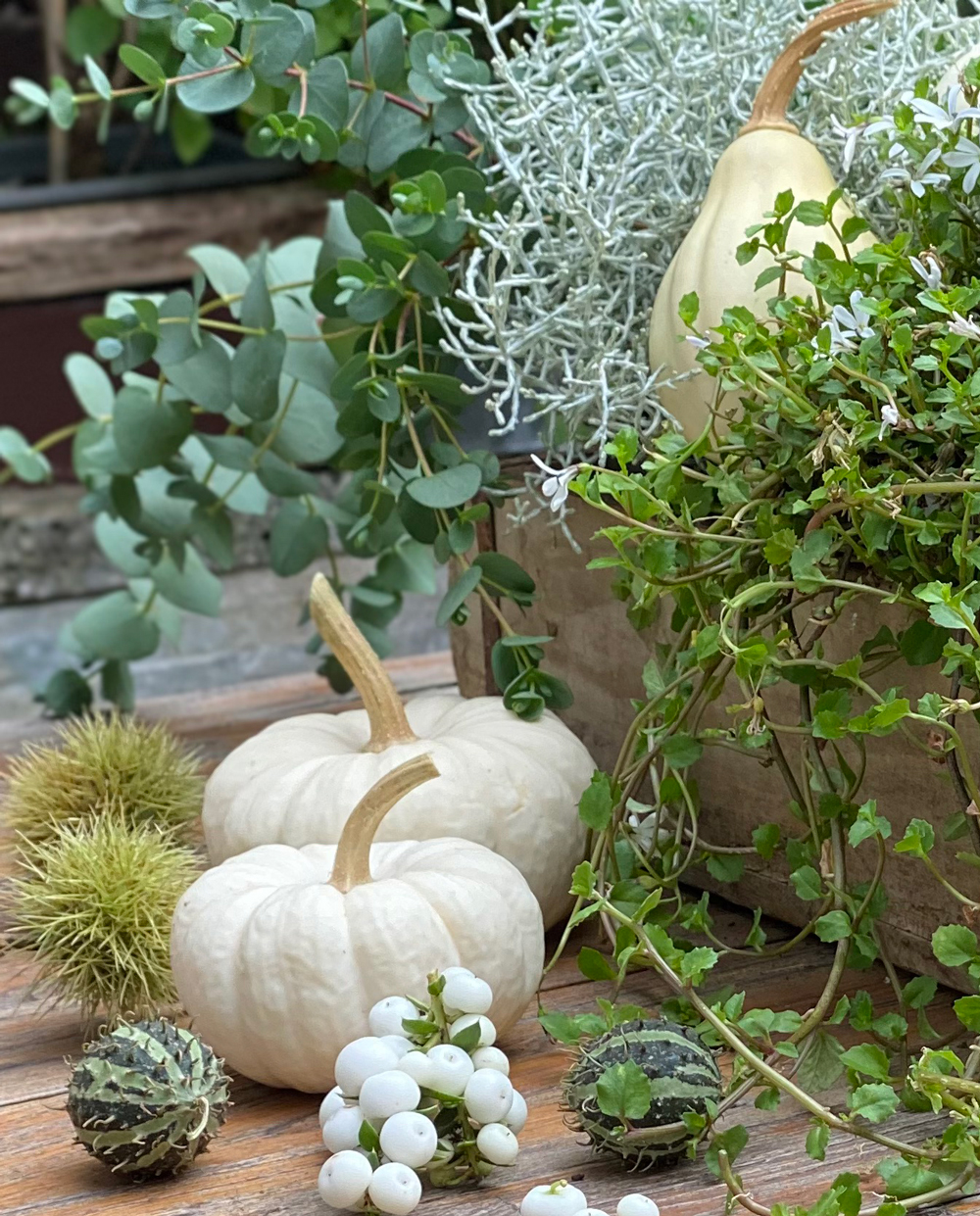 Ob modern, rustikal oder minimalistisch – mit diesem kleinen Kürbis ist alles möglich, sie sind die absoluten Allrounder, die sich vielseitig einsetzen lassen. Durch das schlichte und neutrale weiß lassen sie sich mit fast allem kombinieren. Zum Beispiel ein paar Zweige mit frischem Eukalyptus und drei oder vier Baby Boo – und schon ist die Kaffeetafel gedeckt. Ein Kranz aus Herbst Hortensien oder Hopfen, in die Mitte ein weißer Kürbis – eine wunderschöne Tischdeko. Klein aber oho – ob in Schalen, in Gestecken oder einfach pur, mit diesen kleinen Zierkürbissen zieht eine große Portion Gemütlichkeit ins Haus – drinnen oder auch draußen.