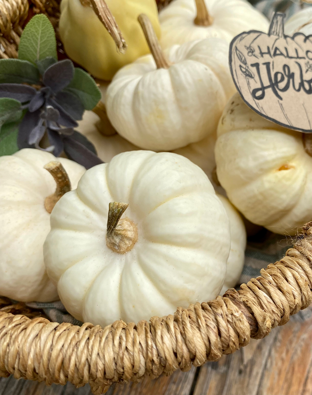 Noch vor drei Jahren war es eine kleine Herausforderung, Baby Boo bei uns im Handel zu bekommen. Einige Male habe ich sie im Internet bestellt, doch die heimischen Kürbis-Bauer haben nun auch hier den großen Run auf diesen hübschen Zierkürbis erkannt und die Nachfrage ist enorm, wie mir auf dem Biohof bestätigt wurde. Meist haben Baby Boo einen Durchmesser von 10 bis 15 Zentimeter, die ideale Größe sie pur mit einem Sträußchen aus Salbei im Korb in Szene zu setzten.