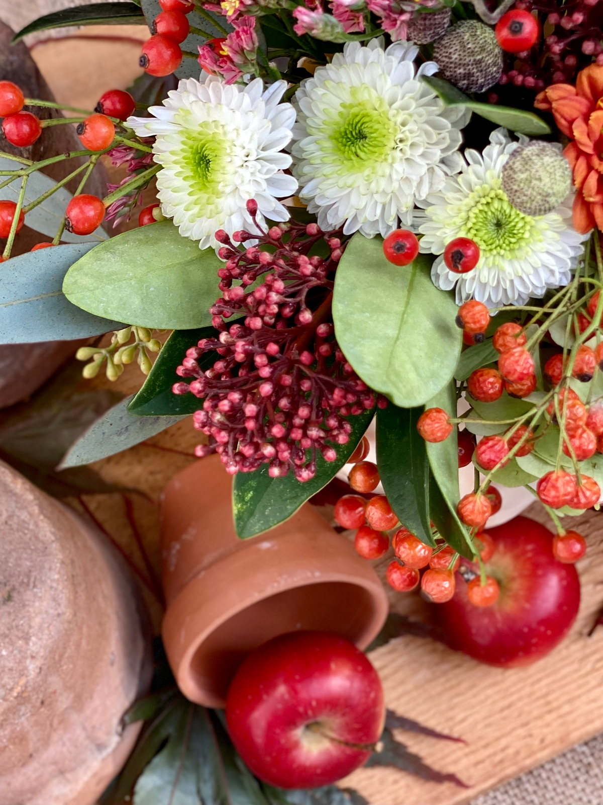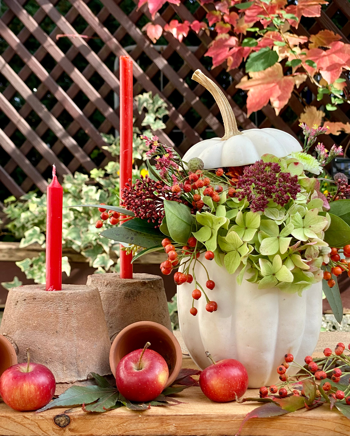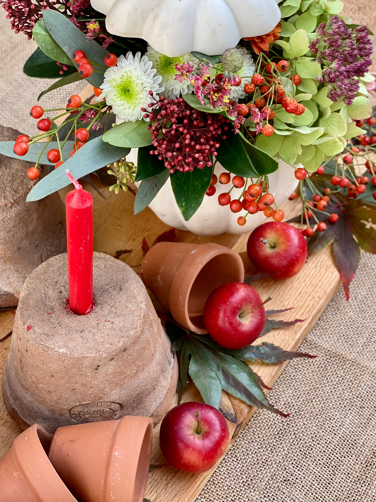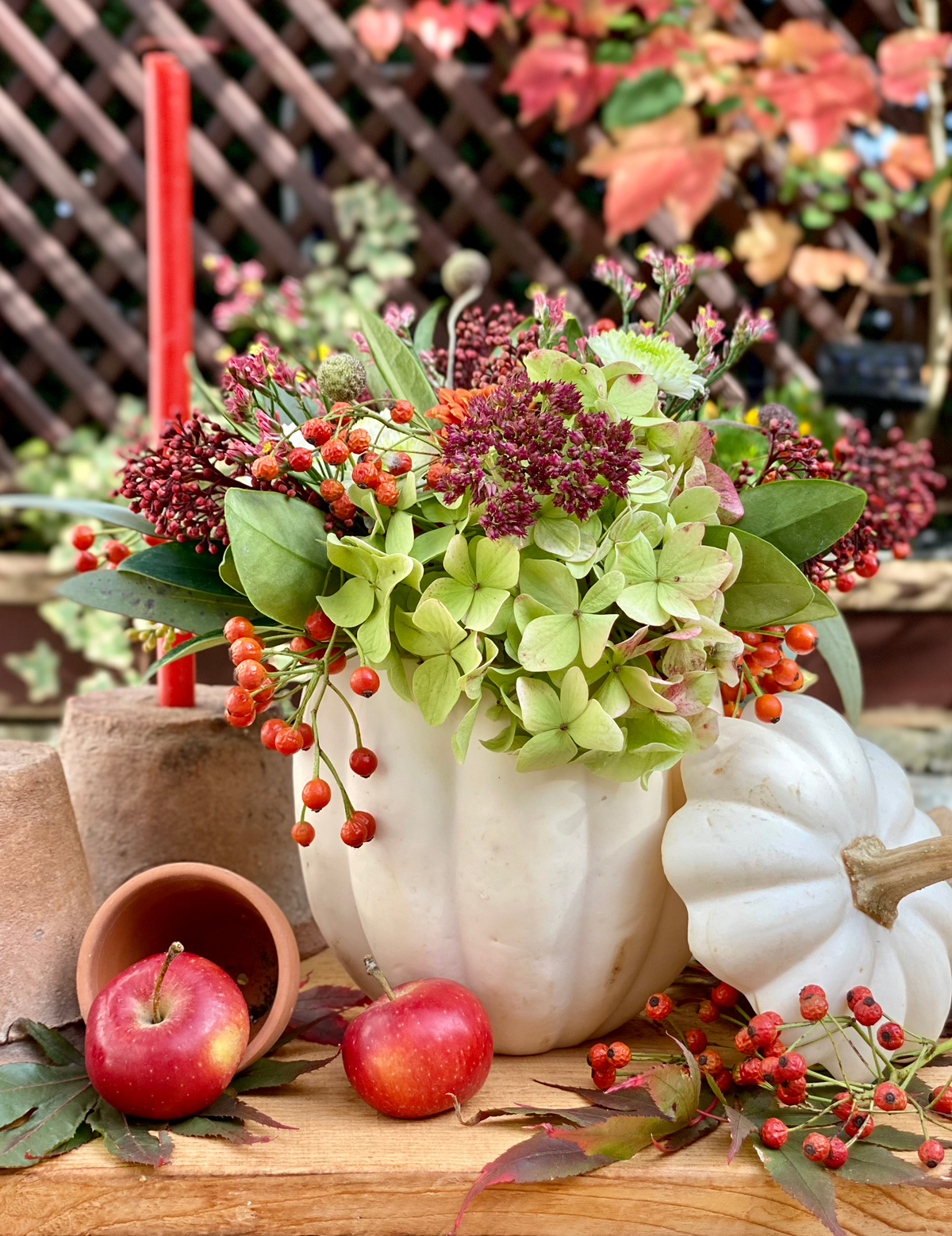 Anschließend wird ein Gefäß in den Kürbis gestellt und dafür habe ich ein altes Gurkenglas verwendet. Mein Strauss besteht aus Hortensien, Kapseln von der Herbstanemone, Fette Henne, Hagebutten, dunkelrote Skimmia, Chrysantemen und Strandflieder, ein buntes Arrangement vom Floristen und aus meinem Garten. Damit die Blumen möglichst lange halten, wechsele ich das Wasser alle zwei Tage. Der Deckel vom Kürbis kann mit drei langen Schaschlik Spießen versehen werden und auf den Kürbis gesetzt werden.
