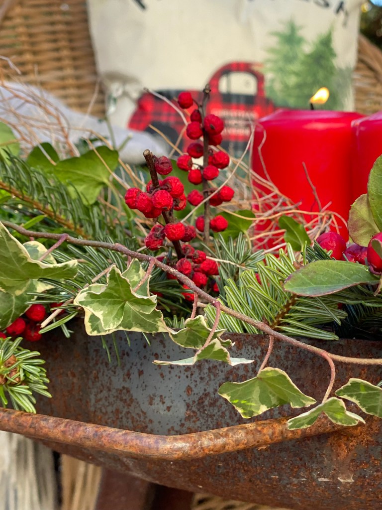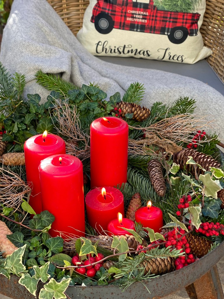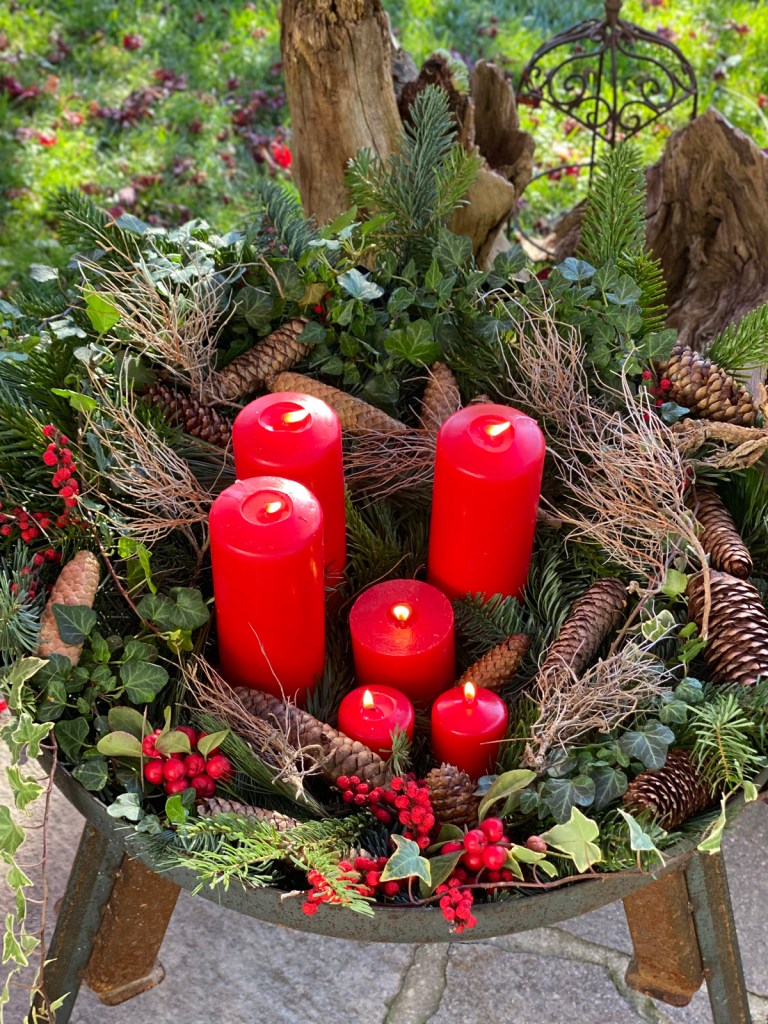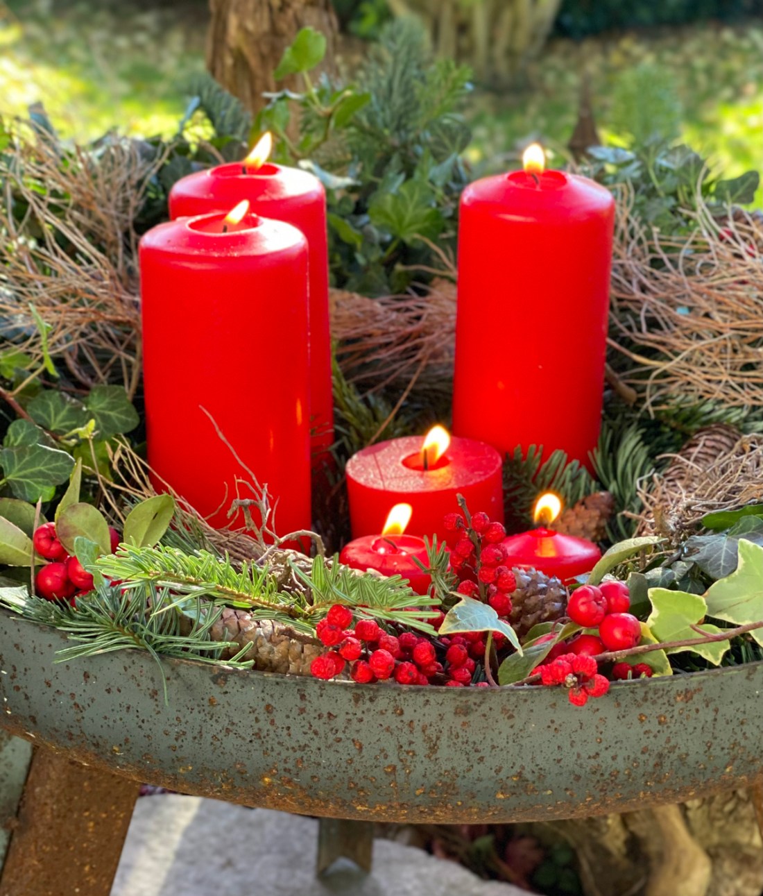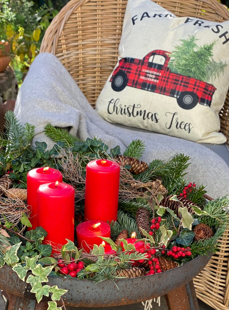 Mit Tannengrün, Ilex, Efeu aus dem Garten, Zapfen und ein paar rote Kerzen. Es wäre doch schade, wenn man so ein schönes Objekt über der Winter einfach in die Garage stellen würde. Sicherlich gibt es auch im Dezember ein paar schöne Tage, an denen man den Nachmittag draußen auf der Terrasse verbringen kann. Abends leuchtet dann die Lichterkette, die ich um die Feuerstelle gewickelt habe.