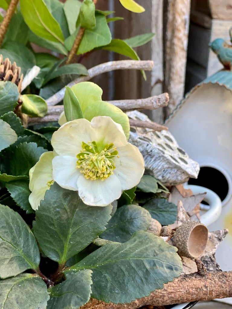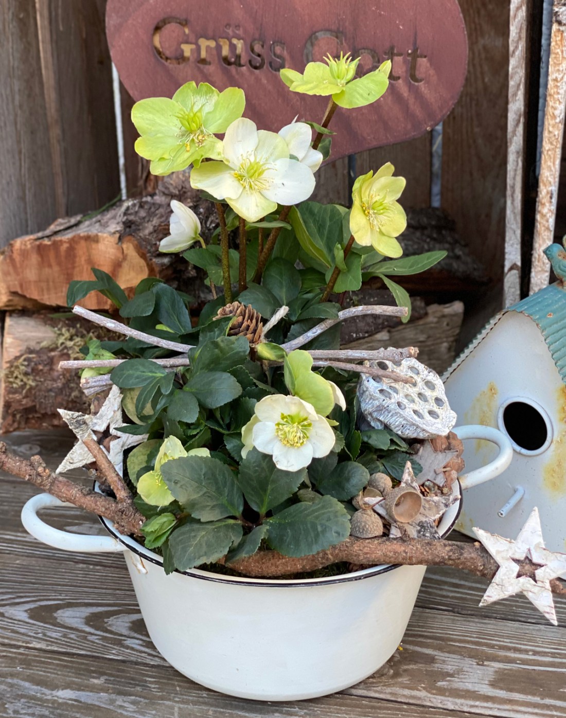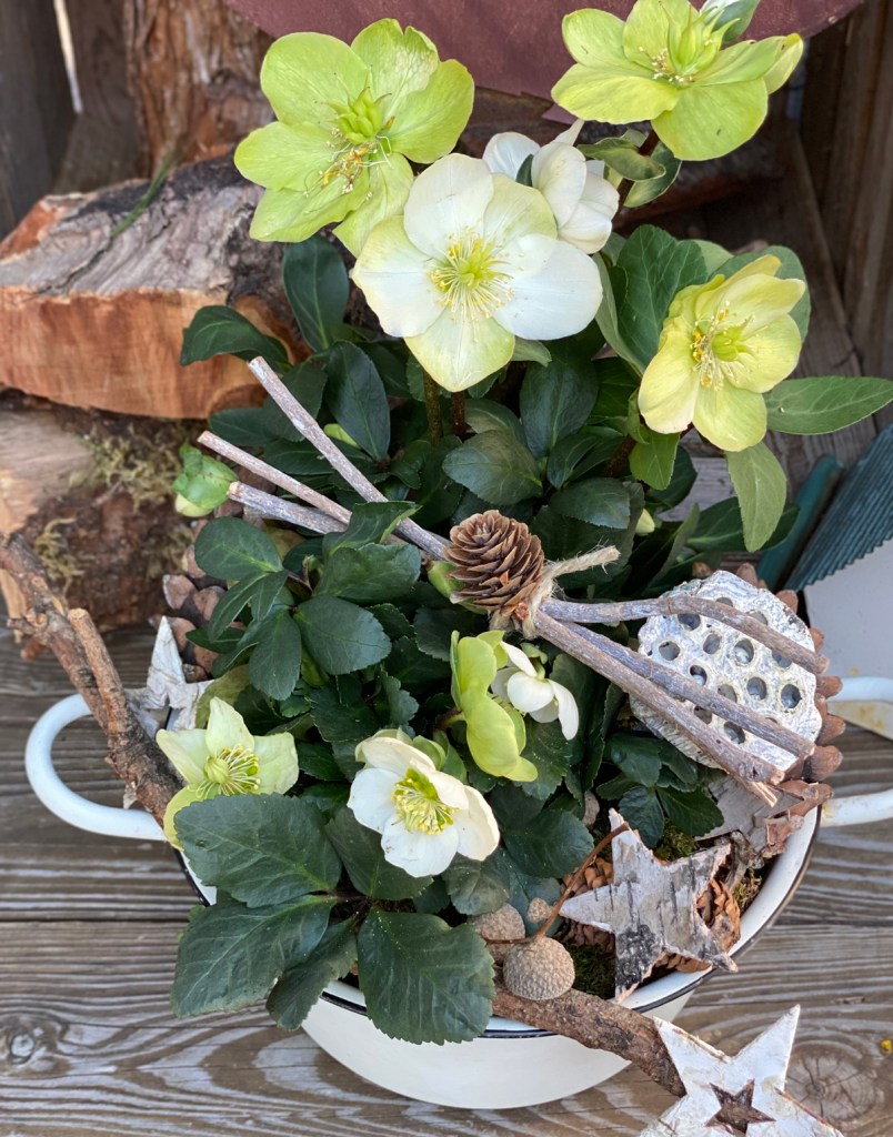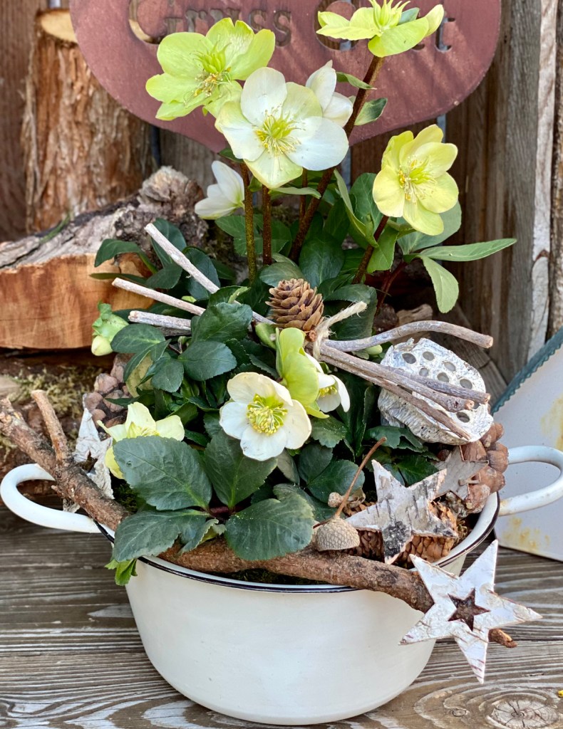 Neben Weihnachtsstern sind Christrosen eine wunderschöne Geschenkidee für Weihnachten. Aber einfach im Plastikblumentopf verschenken? Auf keinen Fall! Entfernt zuerst den Topf und setzt die Christrose in ein hübsches Gefäß, das unbedingt am Boden ein Abzugsloch hat. Mit Zweigen aus dem Garten, beklebten Zapfen, getrockneten Eicheln und Holzsternen habe ich das Gesteck verziert. Ein Geschenk mit wenig Aufwand, das jedem Blumenliebhaber ein Lächeln ins Gesicht zaubert.