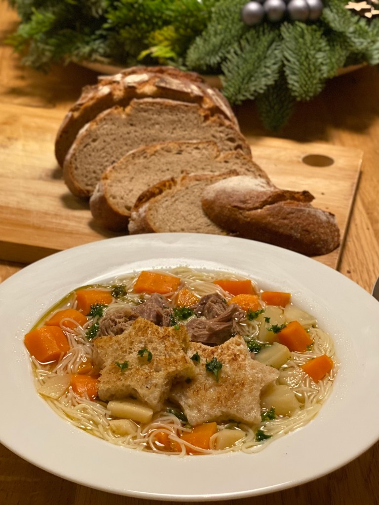 In meiner Familie wird sehr gerne Suppe gegessen und am letzten Wochenende gab es die kräftige Rindfleischsuppe schon einmal zur Probe. Vielleicht findet ihr Gefallen und probiert die Suppe an den Feiertagen als Vorspeise oder zwischen den Feiertagen als Hauptgericht – nach üppigem Festmahl wie Gänse- oder Entenbraten. Eine gute Suppe weckt die Lebensgeister, streichelt die Magennerven und heißt in Bayern liebevoll „Supperl“.