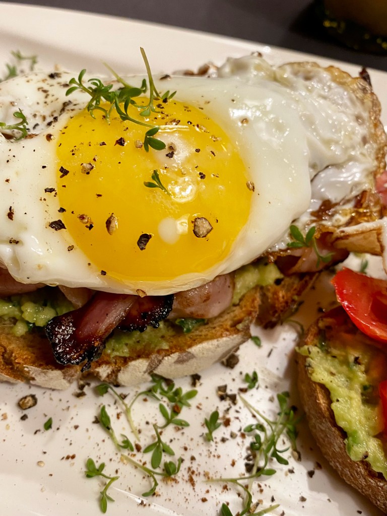 Ins neue Jahr starte ich mit einem herzhaften Frühstück, Wohlfühlessen für die Seele nach einer langen Silvester-Nacht. Als Erstes röstet ihr das Brot, entweder im Backofen oder im Toaster. Danach wird Bacon in einer Pfanne scharf angebraten – vom Duft wird man jetzt erst richtig wach. Zugleich werden in einer zweiten Pfanne die Spiegeleier angebraten. Eine Avocado wird zerdrückt und mit Zitronensaft, Salz und Pfeffer gewürzt. Cocktailtomaten klein schneiden und etwas salzen. Alle Zutaten nun auf die Brotscheiben legen. Saftig, frisch und rustikal. Bei dieser Kombination läuft mir schon beim Schreiben das Wasser im Mund zusammen. Für die Gesundheit gibt es einen Smoothie mit Himbeeren aus dem eigenen Garten, die ich in großen Mengen eingefroren habe. Also raus aus den Federn und ab an den Herd.