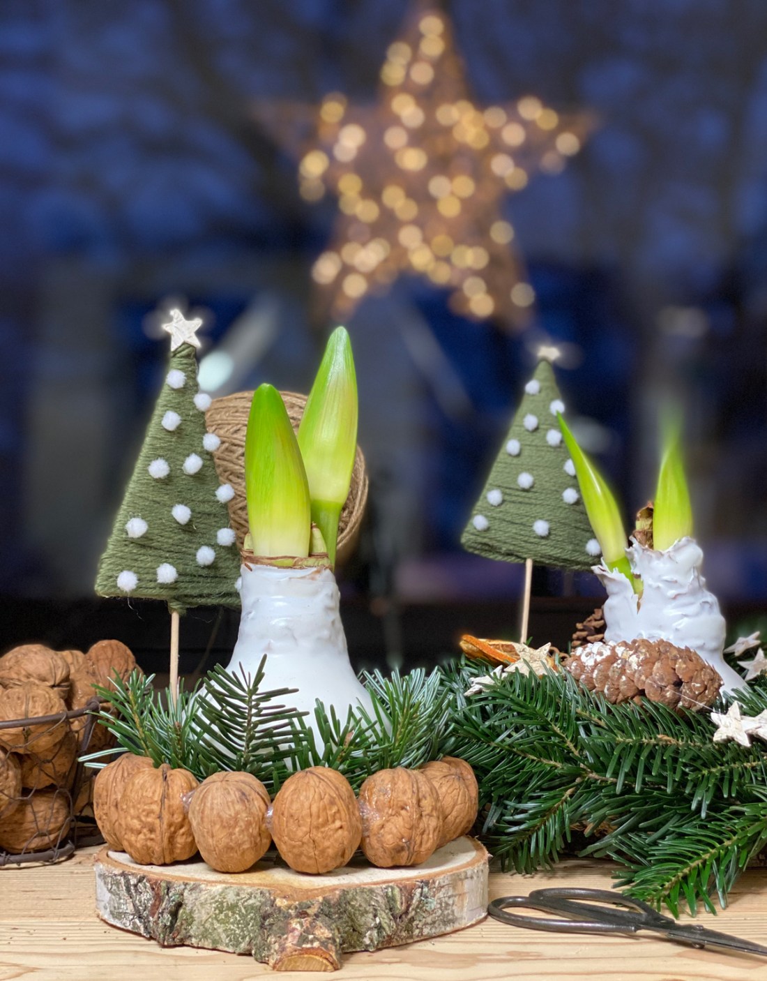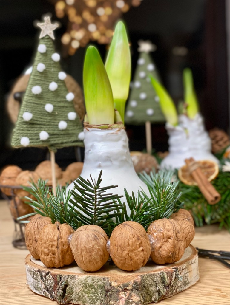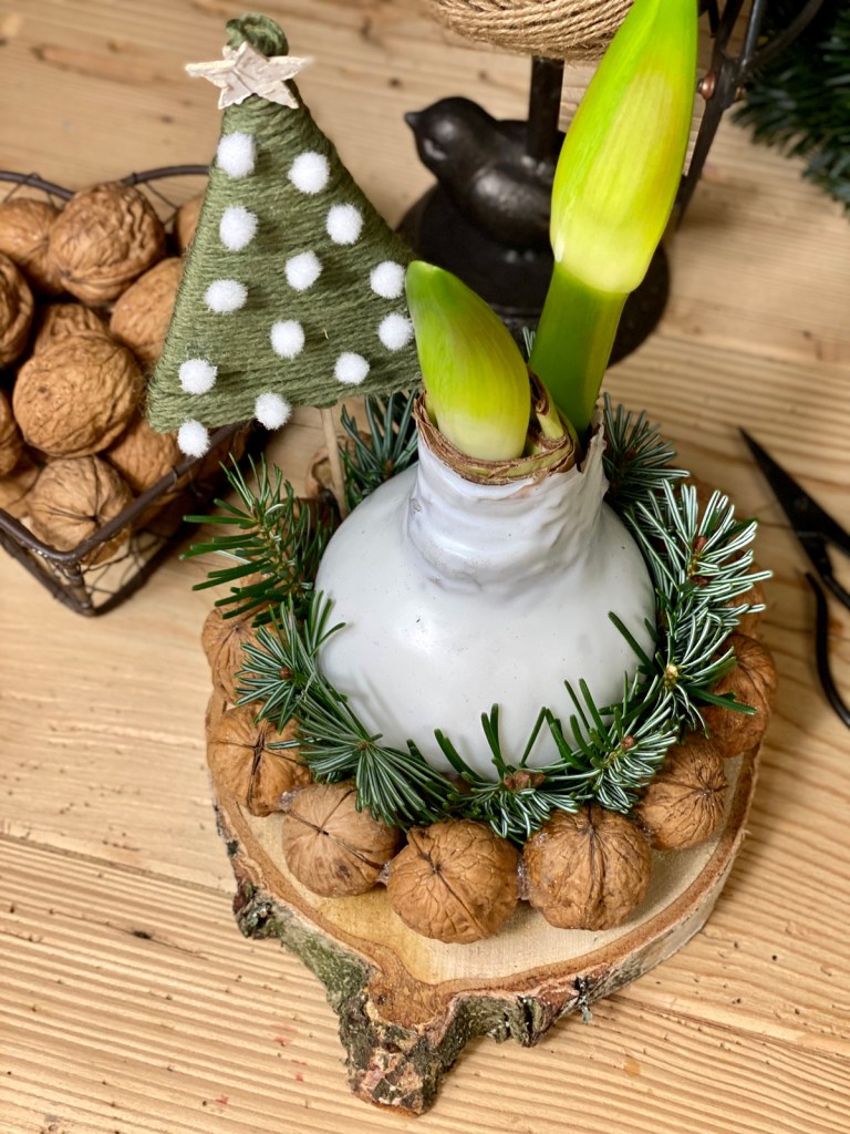 Der Walnuss Kranz erfordert etwas Geduld und Fingerspitzengefühl, ist jedoch eine schöne, nadelfreie Alternative zu Tannengrün. Um die perfekte runde Form zu bekommen habe ich eine runde Schale auf den Tisch gelegt. Platziert nun eine Walnuss nach der anderen und fixiert sie mit einem Klecks aus der Heissklebepistole an der vorherigen Nuss. So arbeitet man Nuss für Nuss bis die Rundung entsteht. Den Kranz auf die Seite stellen und einen Tag gut trocknen lassen. Am nächsten Tag wird der Walnuss Kranz auf eine Birkenscheibe gelegt, die Zwischenräume mit Tannengrün auffüllen und die Amaryllis in die Mitte stellen.