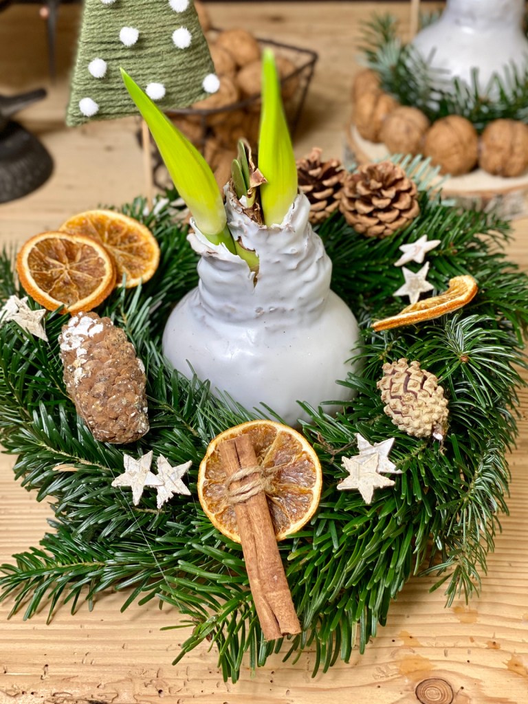 Kurz vor Weihnachten habe ich gewachste Amaryllis besorgt und in einen kühlen, doch hellen Raum gestellt. An den Feiertagen kamen dann Zweifel auf, ob ich die gewachsen Knollen einfach nackig überreichen könne. Bei Pinterest wurde ich dann fündig und zum Glück waren alle Utensilien für meinen Plan vorrätig. Zuerst habe ich aus Tannengrün einen kleinen Kranz gebunden auf eine Birkenscheibe gesetzt und mit Holzsterne, Zapfen und Orangenschalen geschmückt. Die Tannenzweige werden mit Draht auf einen Strohrömer gebunden und in der Mitte wird die Amaryllis gesetzt.