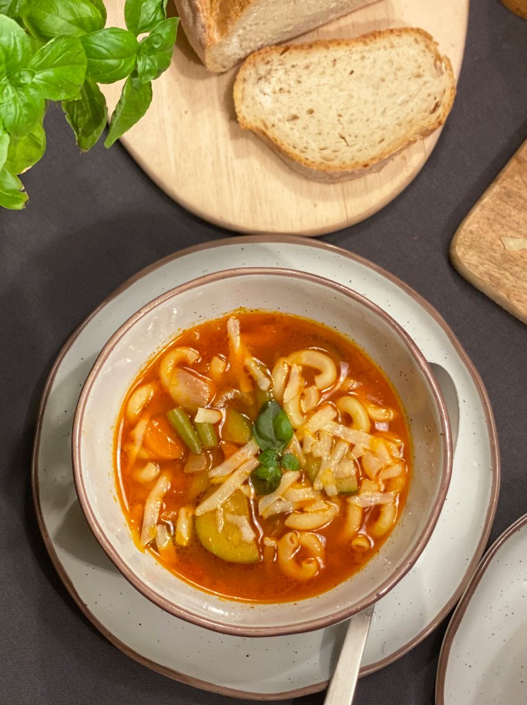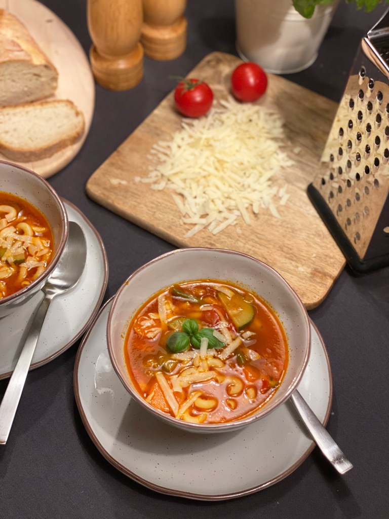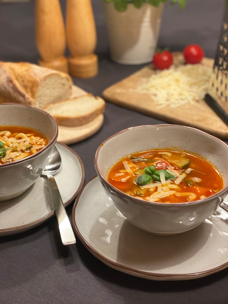 Die klassische Gemüsesuppe ist nicht ohne Grund der Star unter den Vorspeisen in Italien, doch manchmal reicht sie bei uns auch als Hauptgang. Für die leckere Suppe braucht es nicht viel – außer Gemüse, Kräuter, Parmesan und Pasta. Im Moment spielt das Wetter wieder verrückt und man könnte denken, es ist schon April, abwechselnd Regen und Schnee. Wenn man durchgefroren vom Pferdestall heimkommt, ist eine heiße Suppe ideal, um sich aufzuwärmen. Wie schon erwähnt, kommt Minestrone aus Italien und das Wort leitet sich von „Minestra“ ab, das Suppe bedeutet. Je nach Region werden unterschiedliche Zutaten verwendet, doch das wichtigste ist Gemüse und Parmesan. Ob man nun Kartoffel oder Pasta, grüne oder weiße Bohnen verwendet ist Geschmacksache und auch bei der Gemüseauswahl kann variiert werden. In jedem Fall gehören Karotten, Staudensellerie und stückige Tomaten in die Suppe.