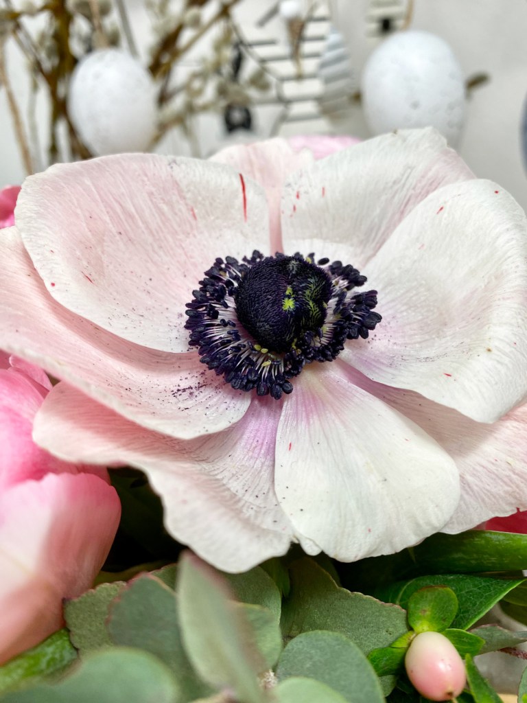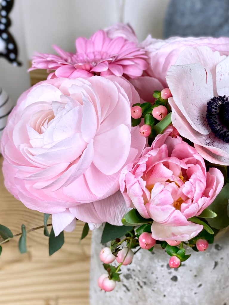 Für das Wochenende habe ich mir einen Blumenstrauß in Rosa zusammengestellt, mit Ranunkeln, Tulpen, Anemonen, Gerbera, Hypericum und Eukalyptus. Der Frühling steht in den Startlöchern, doch bis die Pflanzen draußen ihre Blüten zeigen und das letzte Wintergrau verschwunden ist, wird noch eine Zeit vergehen. Winterlich frische Temperaturen sowie Regen oder Schnee, für das Wochenende und auch die nächste Woche sind die Aussichten ziemlich schmuddelig.