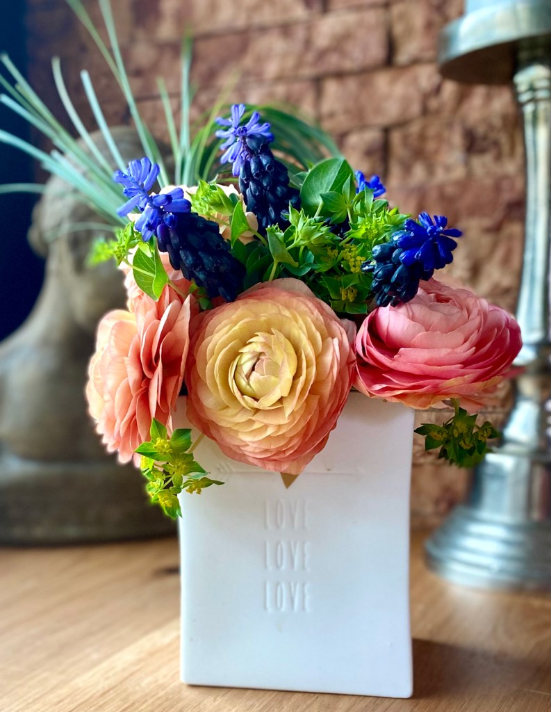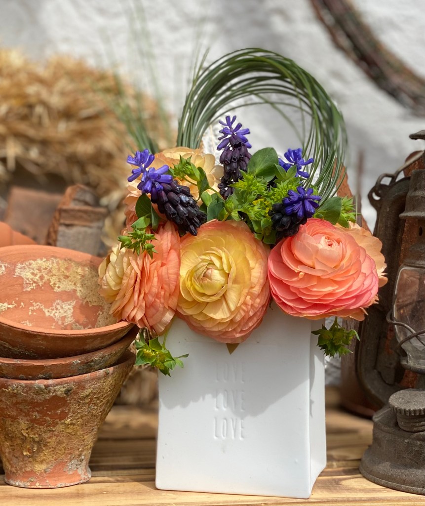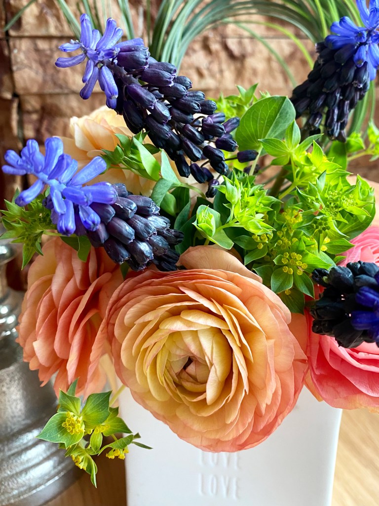 In der Vase halten Ranunkeln meist 10 bis 12 Tage und das geschenkte Sträußchen habe ich mit Muscari aus meinem Garten, Bupleurum vom Floristen und einem Ring aus Bärgras gebunden. Dafür wird ein Büschel Bärgras zu einem Ring geformt, sodass die Stiele im Wasser stehen können. Den Ring mit etwas Blumendraht befestigen und die Enden nach Bedarf schräg zugeschnitten, sodass sie in die Höhe stehen. Nun hoffe ich, dass die Pfingstrosen bald blühen, denn dann kann ich mir meinen Wochenendstrauß aus dem eigenen Garten binden.