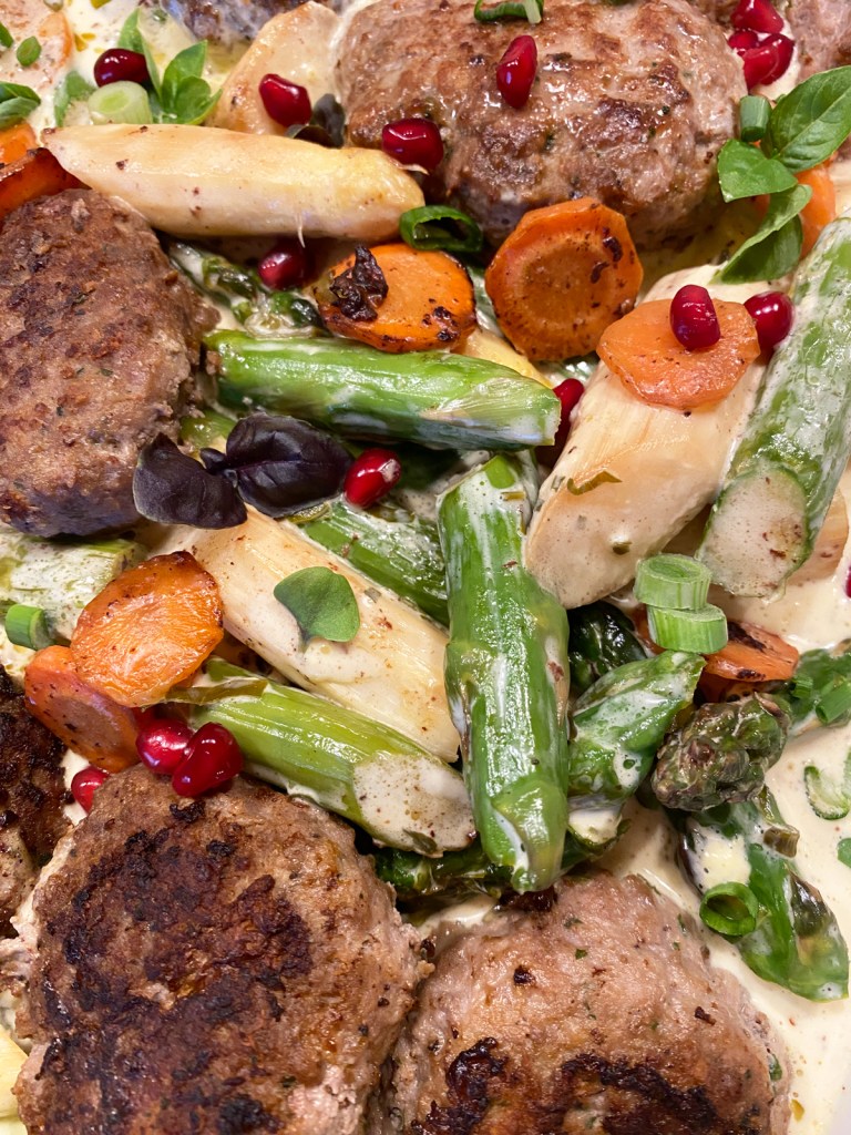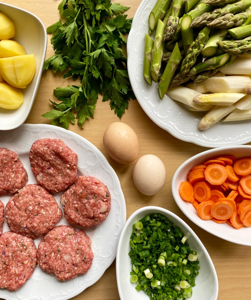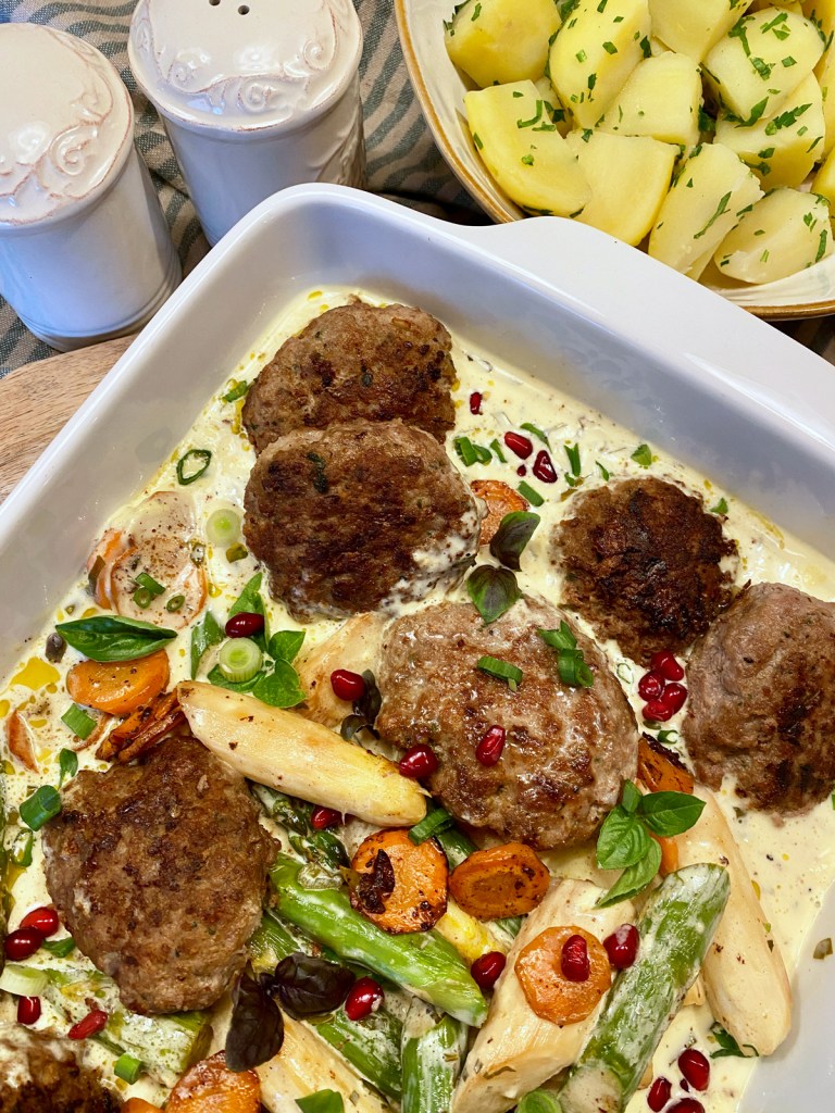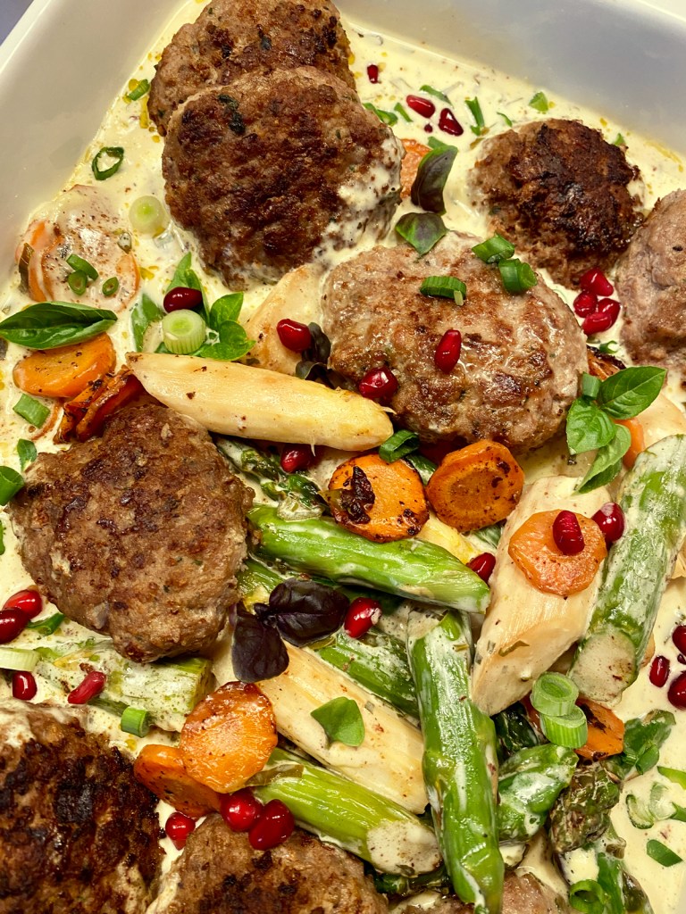Bis Ende Juni können wir das feine Gemüse noch genießen, frisch vom Wochenmarkt. Spargel als Suppe, Salat und Pasta, klassisch zu Schinken oder Sauce hollandaise oder darf es etwas rustikaler sein – mit Frikadellen aus dem Ofen. Ich wollte gerne ein wenig Abwechslung in die Spargelsaison bringen und dieser cremiger Spargeltopf ist vor allem eins – gut für die Seele. Ein Mix aus grünem und weißem Spargel mit herzhaften Frikadellen und einer cremigen Sauce. Was zuerst von meiner Familie infrage gestellt wurde, doch übrig blieb nichts und geschmeckt hat es allen.