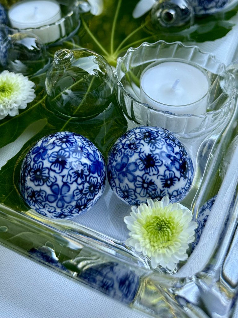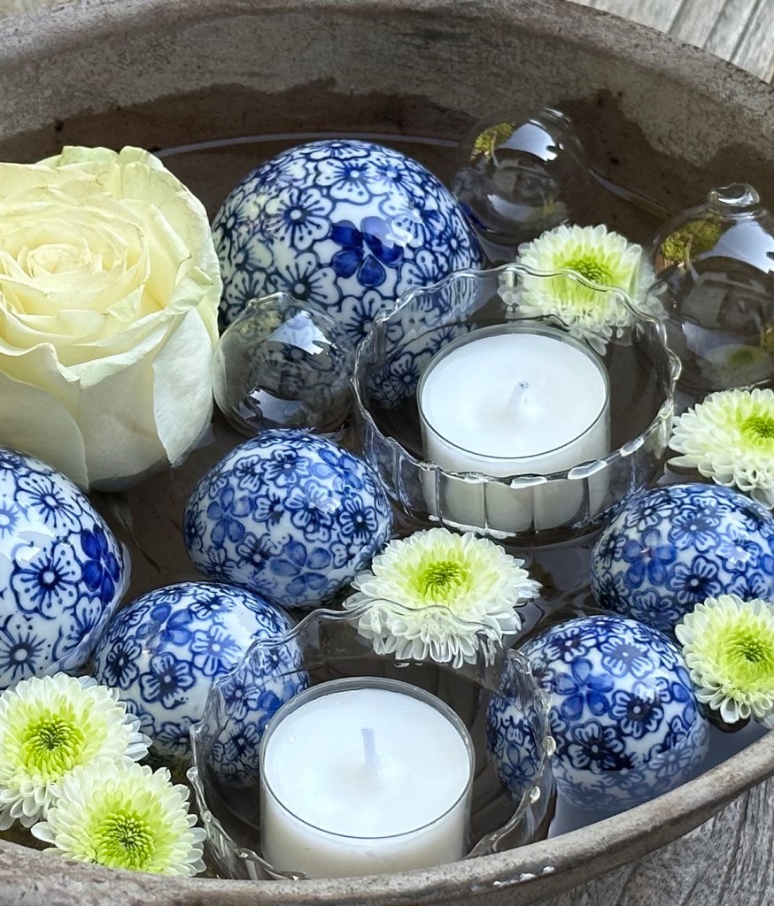 Natürlich darf die Tischdekoration nicht fehlen und schwimmende Blumen in einem Gefäss sehen einfach wunderschön aus und halten länger als in der Vase. Besonders haltbar und geeignet sind Rosen, Chrysanthemen, Nelken oder Gerbera. Mit Blättern, Glaskugeln und Schwimmkerzen kann man das ganze noch hübsch gestalten. Besonders die neuen Porzellankugeln in blau (die ich bei Amazon) bestellt habe machen ein schönes Bild, bei Sonnenschein oder Abends bei Kerzenlicht.