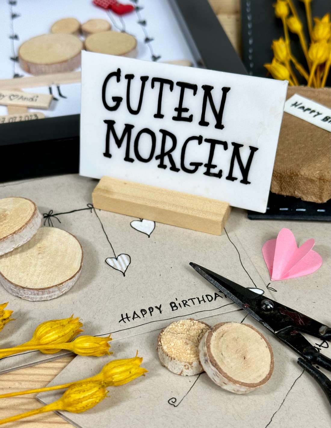 Zur Hochzeit sind Geldgeschenke die absoluten Favoriten. Wenn die gute Freundin heiratet, keine konkreten Wünsche äußert und der Hausstand komplett ist, greifen viele zum klassischen Geldgeschenk. Hochzeiten sind teuer, heiraten sowieso und das Leben als junges Ehepaar, das in einigen Monaten das erste Kind erwartet, erst recht. Wenn die Spardose vom Brautpaar nicht schon vor der Trauung leer war, ist sie es spätesten nach der Hochzeit und dann hilft nur das gute, alte Geldgeschenk. Bei Pinterest habe ich einen schönen Text für die Glückwunschkarte gefunden und zum Andenken an ihre Hochzeit noch ein Bild gebastelt. Die Idee bei Pinterest war mit flachen Steinen angefertigt, die ich leider nicht hatte. Dafür habe ich kleine Birkenholz Scheiben verwendet und denke das Ergebnis kann sich sehen lassen.