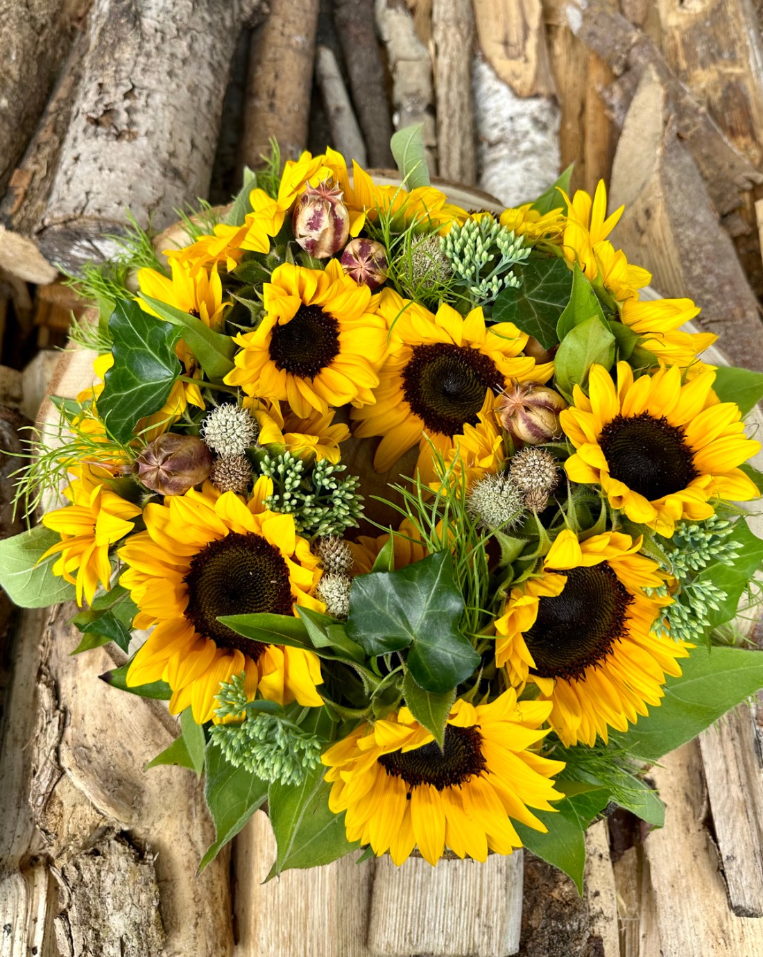 In unserer Nachbarschaft gibt es einen Bio-Gärtner, der auf einer Wiese im Laufe der Jahre eine kleine Plantage errichtet hat. Dort wird je nach Saison Gemüse angebaut und jetzt ist Erntezeit. Die Nachfrage ist sehr gut, Ernten muss man selbst, im Gewächshaus wiegen und an der Kasse bezahlen. Am Rand der Gemüsebeete sind Blumen angesät – im Frühling Narzissen und Tulpen, im Herbst Sonnenblumen. Beste Voraussetzungen, an einem Sonntagnachmittag einen gesteckten Sommerkranz aus Sonnenblumen zu basteln. Ein kleiner Tipp: wenn ich zum Blumenfeld fahre oder die Blumen bei meinem Nachbar schneide, nehme ich immer einen kleinen Kübel gefüllt mit Wasser, sodass die Blumen sofort mit Wasser versorgt sind.