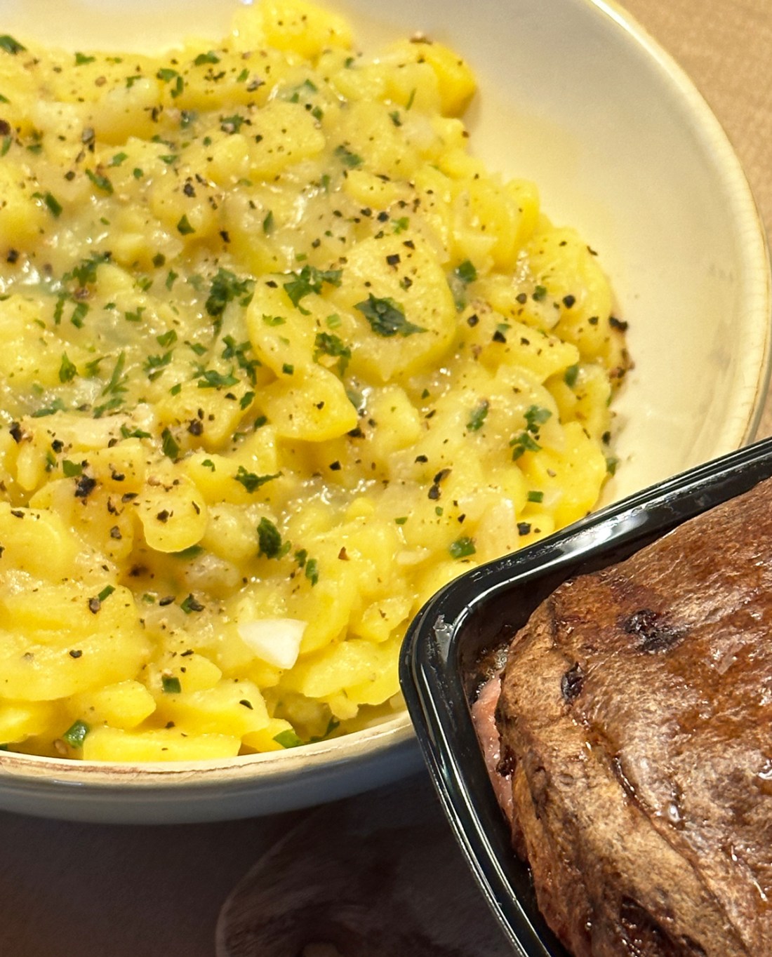 Nun wird die warme Brühe und die Zwiebel unter den Kartoffeln vermischt. Senf, 1 EL Öl, Essig, Zucker, Salz und Pfeffer aus der Mühle mit der Gabel verquirlen, über die Kartoffel geben und ziehen lassen. Kurz vor dem Anrichten den Salat nochmal abschmecken und zum Schluss das restliche Öl untermischen. Petersilie und Schnittlauch dazu und lauwarm servieren.