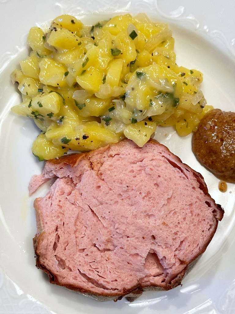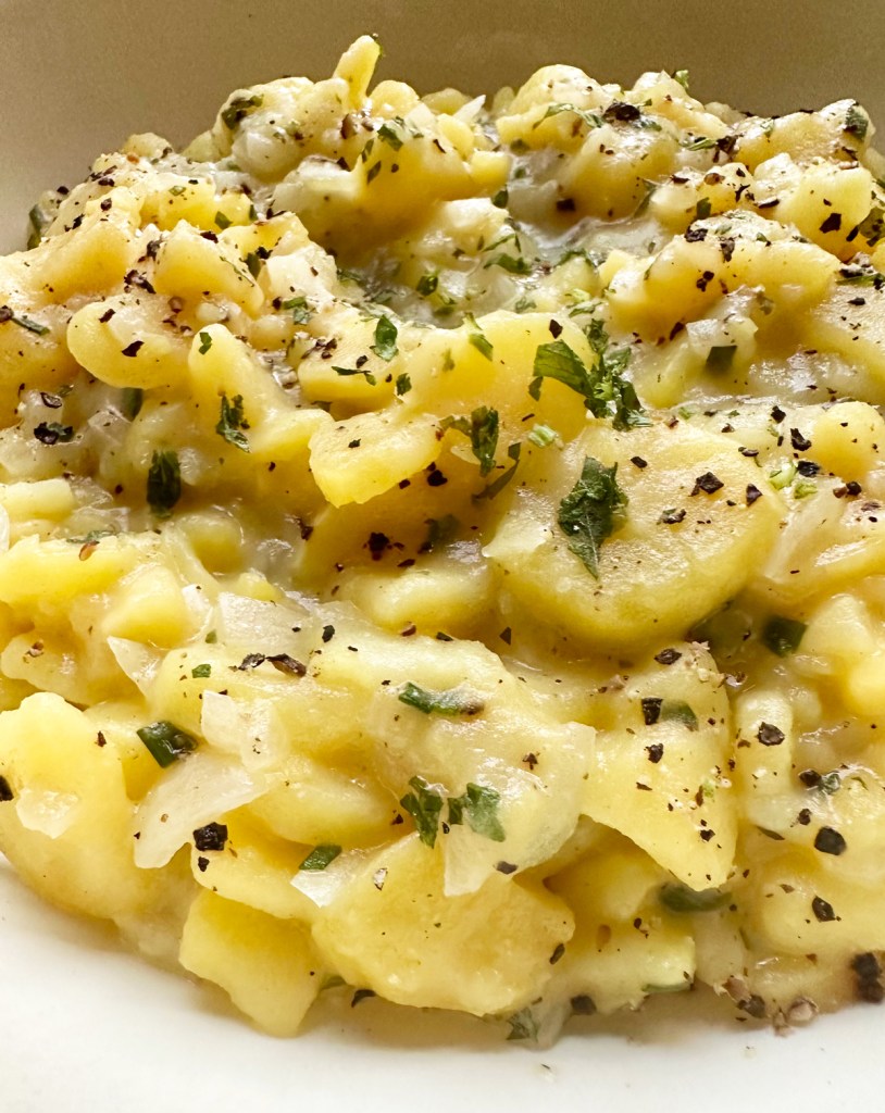 Der klassische, bayrische Kartoffelsalat passt zu vielen Gerichten und er legt sich nicht nur zum Wiener Schnitzel mit auf den Teller. Auch zu Fisch, Bratwurst, Fleischpflanzerl und Leberkäse passt er hervorragend. Ein bayrisches Partybuffet ohne Kartoffelsalat – einfach nicht vorstellbar. Bei der Zubereitung von Kartoffelsalat gibt es viele Variationen. Meist wird Kartoffelsalat mit Mayonnaise zubereitet oder mit Speck, Gurken oder Radieschen. Bei unserem Dorf-Metzger ist die Warteschlange der Handwerker gegen 9 Uhr morgens oft recht lang, er macht den besten Kartoffelsalat weit und breit. Ich mag den Kartoffelsalat am liebsten lauwarm und zeige euch, wie ihn meine Mutter immer zubereitet hat. Das wichtigste für den Kartoffelsalat sind natürlich Kartoffel, aber nicht irgendwelche – festkochend müssen sie sein, sie enthalten weniger Stärke. Sie lassen sich gut in Scheiben schneiden und der Salat hat einen schönen Biss.