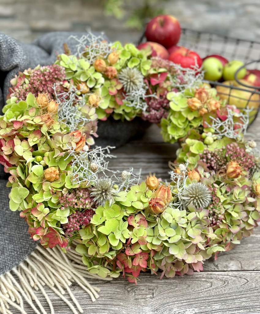 Hortensien sind nicht nur im Sommer eine Augenweide, sondern lassen sich im Herbst zu einem schönen Blumenkranz binden.