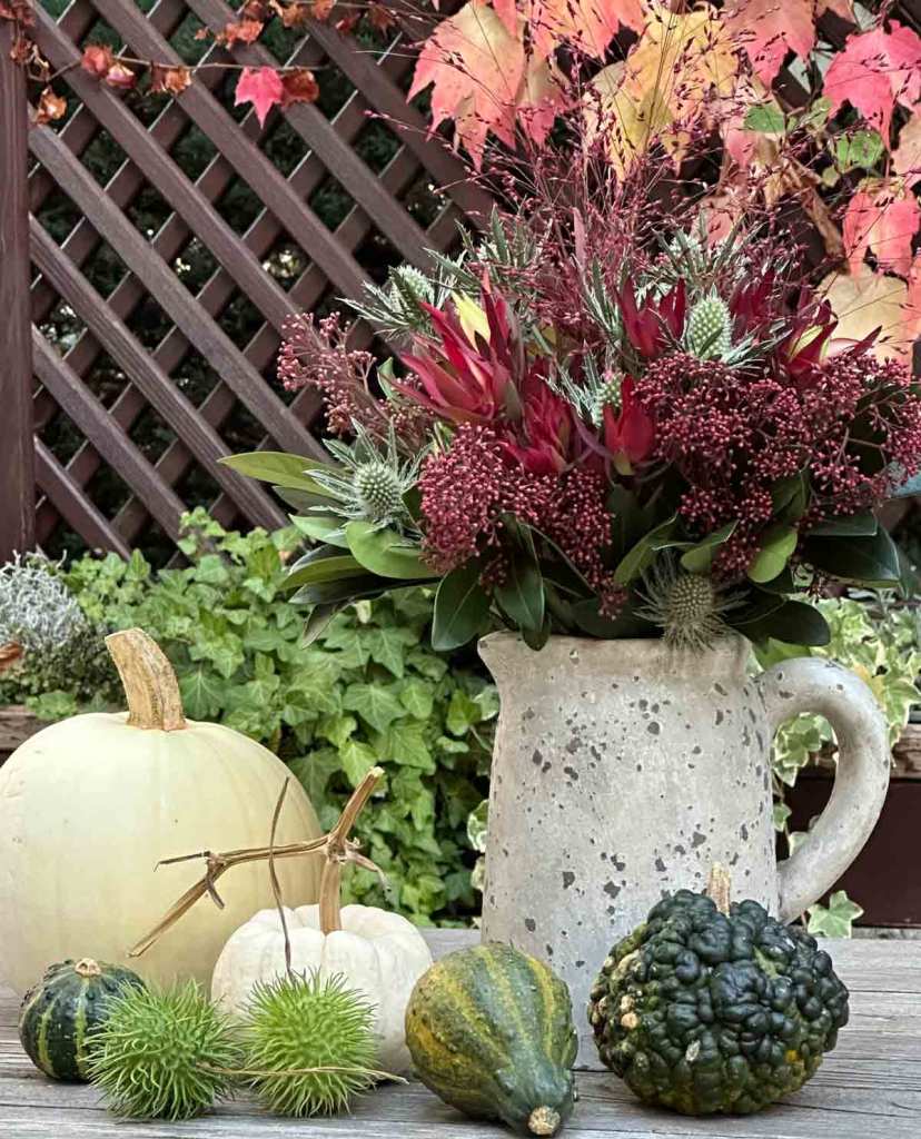 Was viele nicht wissen, Skimmia ist eine tolle Schnittblume, die locker zwei Wochen in der Vase hält. Für meinen Wochenende Strauss habe ich mir bei meiner Floristin weinrote Skimmia, Leucadendron und Silberdisteln ausgesucht. Typische Herbstblumen – farbenfroh, wie der Herbst eben ist. Der Oktober verwöhnte uns in Bayern mit viel Sonne und Wärme, an manchen Tagen sogar mit sommerlichen Temperaturen und angesichts der hohen Energiekosten freut sich die Geldbörse.