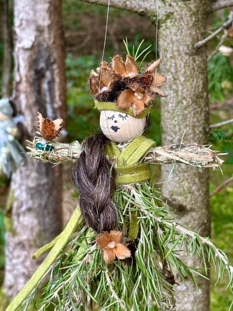 Wir sind nicht die einzigen, immer wieder kommen Spaziergänger, die meisten mit Kindern die den Weihnachtswald, mit viel Mühe und Liebe zum Detail, bestaunen. Besonders die aus Stroh gebastelten Figuren, die wie tanzende Engel an einem Strauch hängen. Mit Perlen, Tannengrün, getrockneten Hortensien, Strohblumen und Wollziest Blätter geschmückt tanzen sie im Wind. An einer Figur hing ein dicker Zopf und ich bin mir nicht sicher, ob er aus Echthaar besteht. Kleine Kunstwerke mitten im Wald. Emmi war das ganze nicht geheuer – besonders vor dem Wichtel mit seinen riesengroßen Augen machte sie einen großen Bogen. Mich würde es brennen interessieren, wer hinter dieser originellen Idee steckt. Einerseits wüsste man es gerne, doch dann wäre das Geheimnisvolle weg und damit das Rätsel um den mysteriösen Weihnachtswald entzaubert.