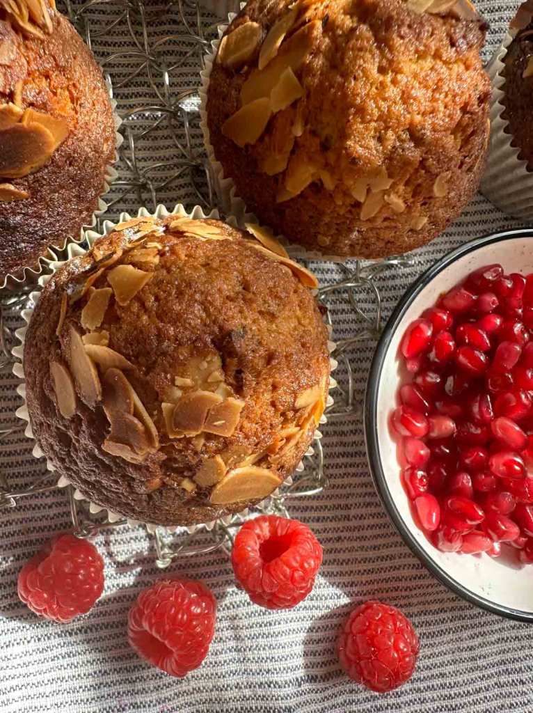 Den Backofen auf 180 Grad vorheizen und die Muffin Form mit Papierförmchen auslegen. Die weiche Butter mit Zucker, Vanillezucker, Milch und Eier gut verrühren. Haselnüsse, gesiebtes Mehl, Backpulver, Prise Salz und Zimt gut vermischen und mit der Butter-Ei Mischung gut verrühren. In die Papierförmchen wahlweise zwei Himbeeren oder einen TL Granatapfelkerne setzen, den Teig darüber verteilen und mit Mandeln garnieren. Im Backofen ca. 25 Minuten backen. Mit dem Holzstäbchen kontrollieren, ob die Muffin gar sind. Die Muffin abkühlen lassen und mit frischen Himbeeren, Granatapfelkerne und Schlagsahne servieren.