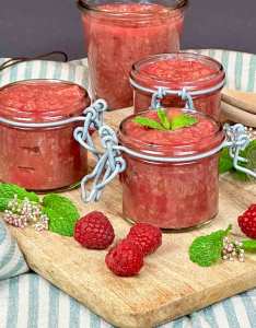 In der Zwischenzeit die Banane und Himbeeren zerdrücken. In die Masse geben und bei schwacher Hitze für 2–3 Minuten köcheln lassen. Für die Frische, Saft einer halben Zitrone dazu, Vanilleschote und Zimtstange entfernen und abschmecken. Zum Abkühlen das Kompott in Gläser verteilen. Guten Appetit!