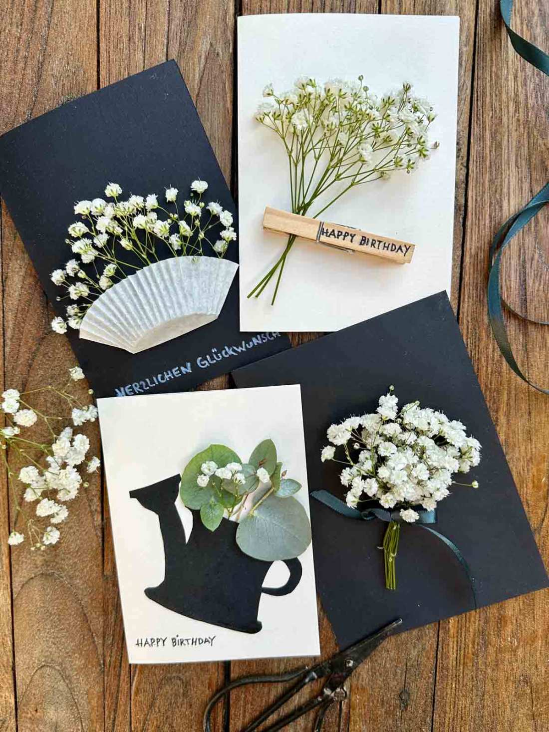 Als Basis dienen Blanko Karten, die es mit passendem Kuvert in vielen Farben im Bastel- oder Schreibwarenladen gibt. Dazu benötigt ihr noch eine Schere, Klebstoff und natürlich die passende Deko für die Karte. Wie zum Beispiel Wäscheklammern, ein Papier Muffin Förmchen, Schleierkraut, schwarzes Bastelpapier und ein paar Blätter wie Eukalyptus oder Efeu. Da diese Woche gleich vier Geburtstage anstehen, war ich gestern Nachmittag kreativ und habe Karten gebastelt. Schließlich sind wir in einem Alter, in dem man sich über eine liebevolle Karte oft mehr freut, als über einen üppigen Blumenstrauß. Die erste Karte ist ganz einfach und schnell gemacht. Das Schleierkraut wird zurechtgeschnitten und ein kleines Sträußchen gebunden. Eine Holz-Wäscheklammer mit „Happy Birthday“ beschriften oder stempeln und auf die Karte kleben. Nun das Schleierkraut mit der Wäscheklammer befestigen und die Geburtstagsgrüße auf einen Einleger schreiben und einkleben.