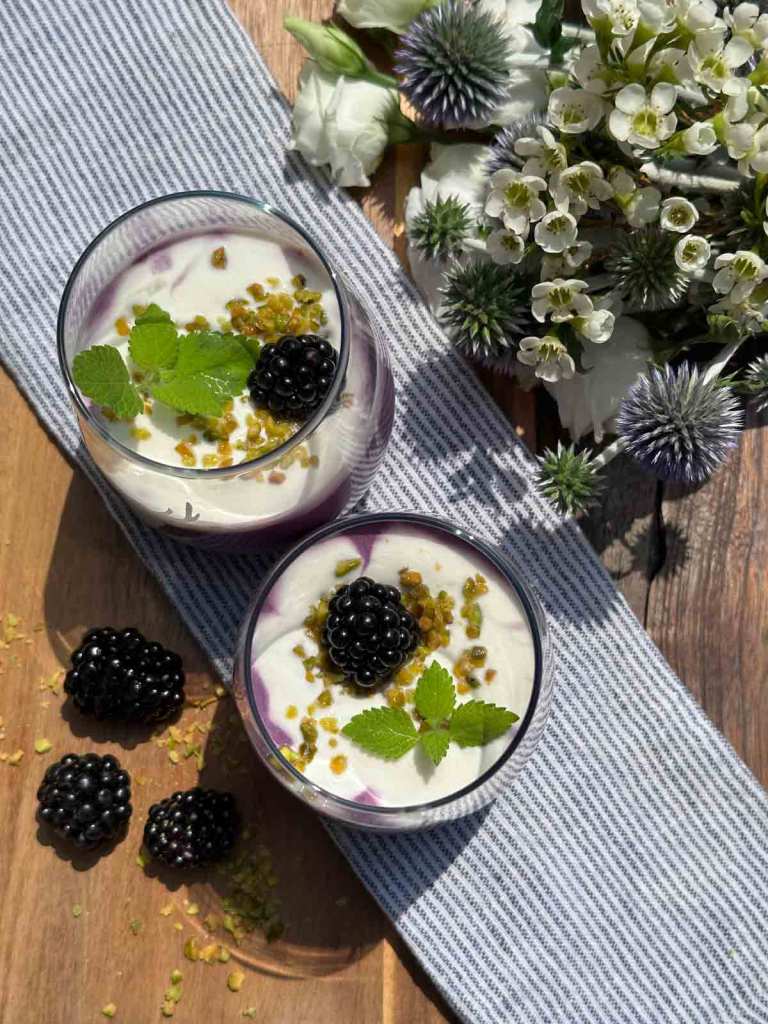 Brombeeren vorsichtig abbrausen und auf einem Küchenpapier abtropfen lassen. Für die Deko ein paar Brombeeren zur Seite legen und die übrigen fein pürieren. Mit griechischem Joghurt vermengen und wer es besonders süß mag, gibt Honig oder Zucker hinzu. Die Masse auf Gläser verteilen, etwas süße Sahne auf die Masse geben, mit Pistazien und Brombeeren garnieren. Guten Appetit!