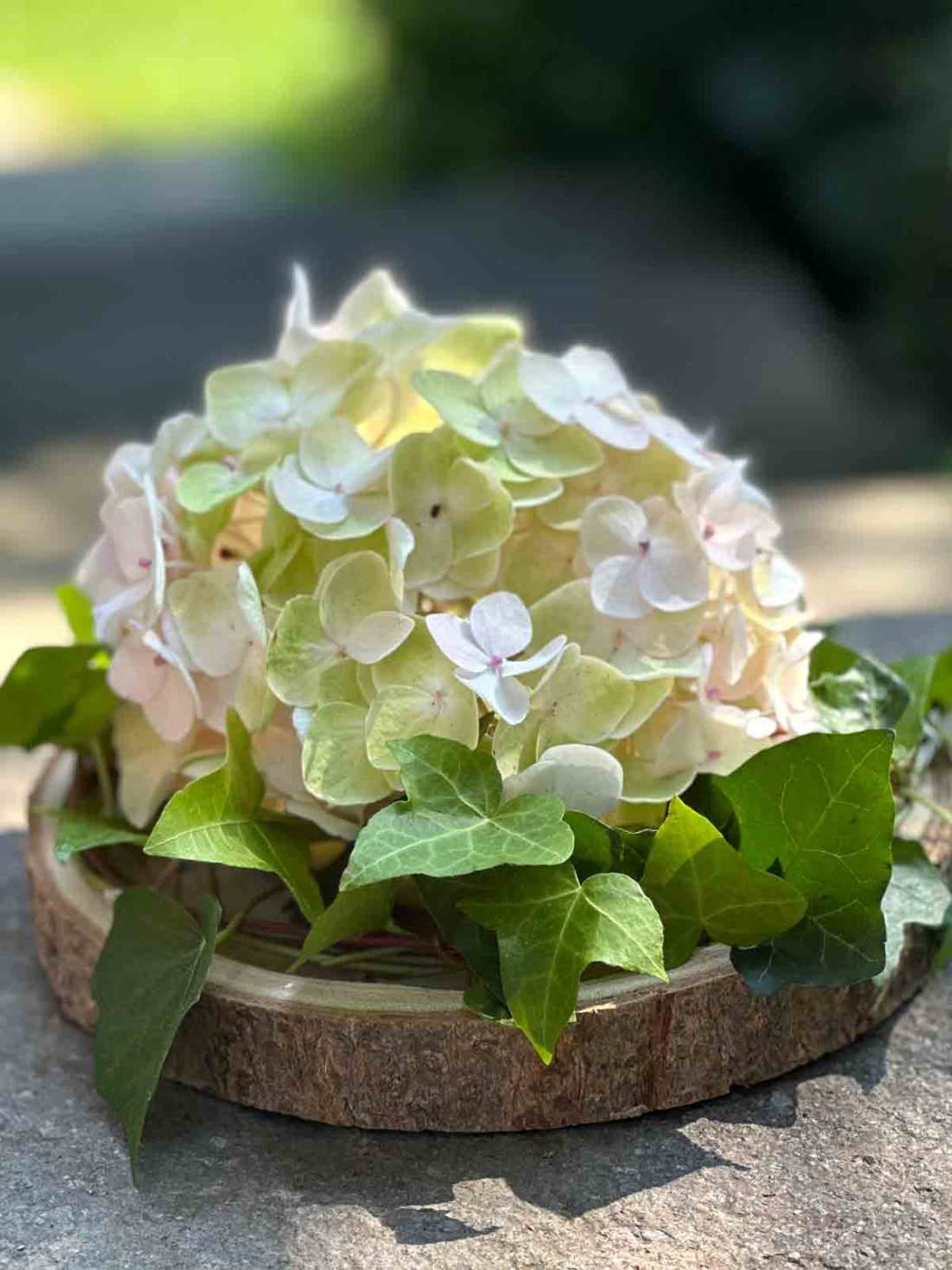 Mit ein wenig Planung kann man ab Frühjahr bis in den Herbst Blumen aus dem Garten schneiden und damit sehr schöne Dekorationen gestalten. Ärgerlich ist es nur dann, wenn von den Hortensien ein Stiel abbricht, weil man nicht aufgepasst hat und so konnte ich mir die Fahrt zu meiner Floristin für meinen Wochenendblumenstrauß sparen. Leider ist die Hortensie ganz nah an der Blüte abgebrochen, sodass ich sie in einen Schwamm stecken musste. Der Steckschwamm wird zuerst ausreichend gewässert und der Teller mit Frischhaltefolie ausgelegt, um ihn vor Feuchtigkeit zu schützen. Um ein wenig „Grün“ in das Gesteck zu bringen, habe ich aus Efeuzweigen, einen Kranz geformt und um die Hortensienblüte gelegt. Wenn die Hortensie frühzeitig schlapp macht, lege ich sie kopfüber ins Wasser und zudem wird der Schwamm täglich auf genügend Feuchtigkeit überprüft.