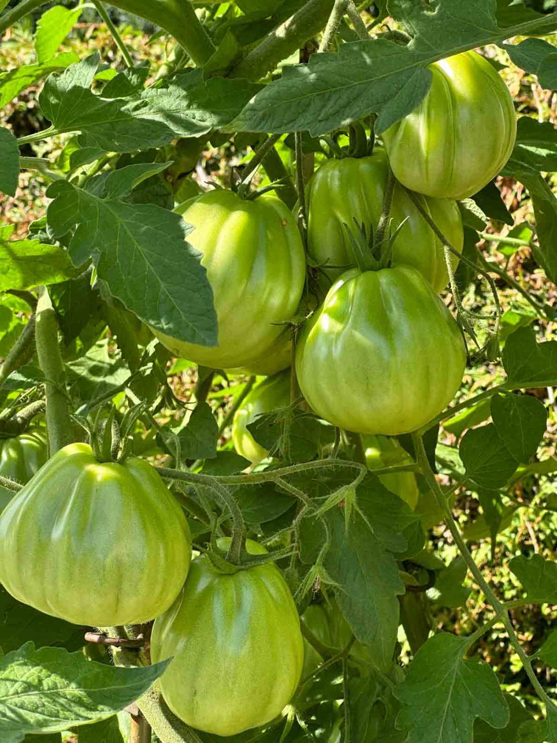 Am besten ist es, schon im zeitigen Frühjahr das Beet mit reifem Kompost anzureichern, so ist die Basis bereits gelegt. Darüber hinaus verwende ich Hornmehl, alternativ kann auch ein spezieller Fertigdünger eingesetzt werden. Hier sollte man sehr genau mit der Dosierung sein und die Bodenbeschaffenheit berücksichtigen. Dieses Jahr muss die Ernte noch warten, die Tomaten sind reichlich und haben bereits eine stattliche Größe, müssen allerdings noch in der Sonne reifen. Tomaten brauchen viel Wasser, bei großer Hitze sogar morgens und abends. Damit Tomaten die ganze Kraft in die Früchte stecken, müssen überflüssige Triebe regelmäßig herausgebrochen werden. Zusätzlich sollten die Blätter unterhalb des ersten Fruchtstandes entfernt werden, damit sich die Tomaten entwickeln können und so bekommen auch die unteren Früchte mehr Licht.
