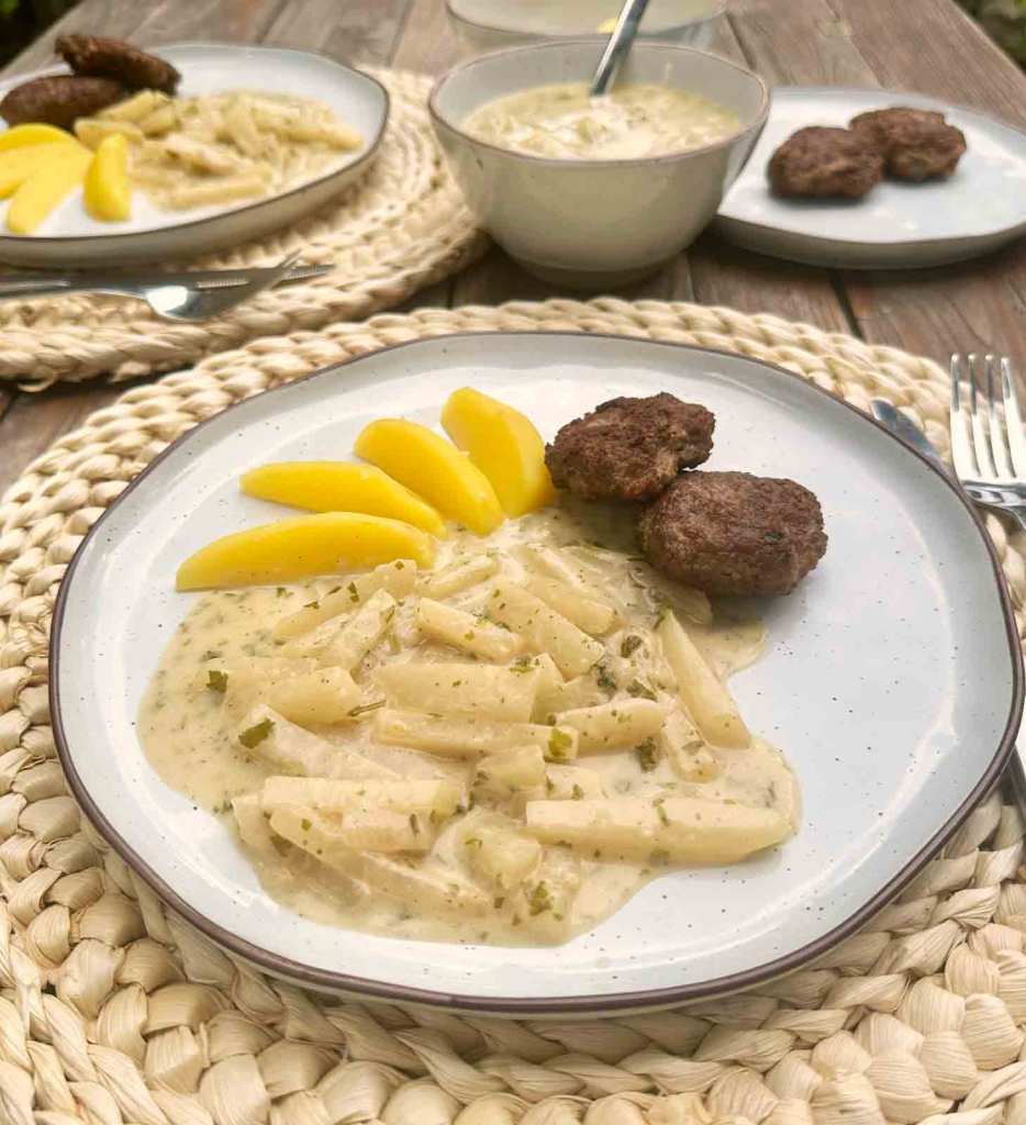 Leicht umrühren und die Soße mit etwas Mehl abbinden. Kurz vor Ende der Garzeit die fein gehackten Kohlrabi Blätter dazu. Für die herzhafte Variante gibt man zu den Zwiebeln gewürfelten Speck. Zum Kohlrabi Gemüse passen Salzkartoffel und Fleischpflanzerl. Guten Appetit.
