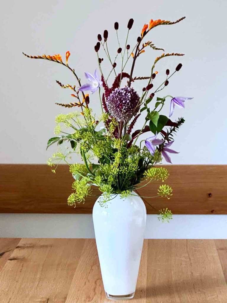 Genauso wie wir Menschen brauchen Blumen vor allem viel Wasser und die Vase sollte – bestenfalls täglich mit neuem, lauwarmen, frischen Wasser gefüllt werden. Dann kann die Vase auch gereinigt werden, damit sich keine Bakterien festsetzen. Auch ein spezielles Frischemittel, das viele Floristen zum Strauss geben, sorgt für eine längere Haltbarkeit der Blütenpracht. Damit die Blumen das Wasser gut aufnehmen können, schneide ich sie jeden Tag neu schräg an. Auch sollte kein Laub unter der Wasserlinie stehen, denn gerade die Blätter regen die Fäulnisbildung stark an. Im Sommer ist die Vielfalt der Blumen, ob beim Floristen oder vom Blumenfeld besonders groß und mit einem schönen Blumenstrauß holt man sich ein großes Stück gute Laune ins Haus.