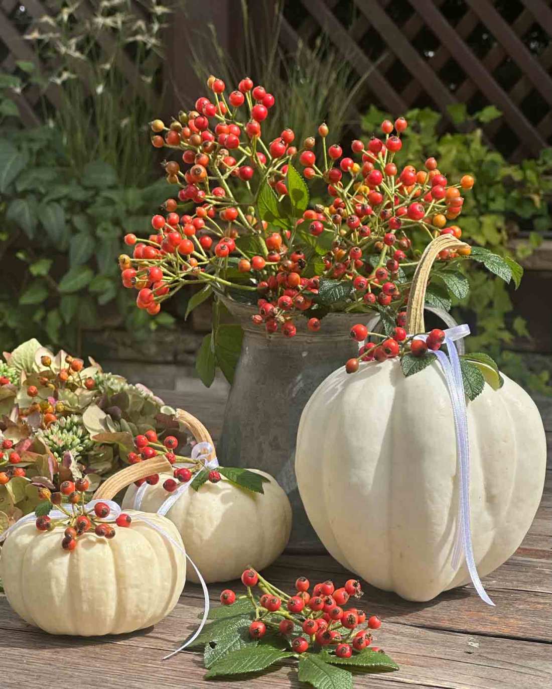 Für die Tischdeko sind Hagebutten und weiße Zierkürbisse eine ideale Ergänzung zum herbstlichen Arrangement. Doch auch Geschenke lassen sich mit Hagebutten hübsch verzieren. Doch Vorsicht! Tragt beim Ernten der Hagebutten Zweige unbedingt Handschuhe zur Ernte, damit ihr euch nicht an den spitzen Stacheln verletzt.