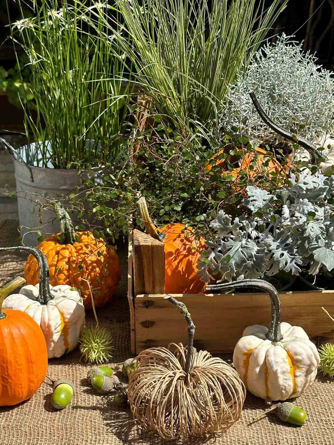Zum kräftigen Orange der Kürbisse passt perfekt das herbstliche Laub und auch sonst bietet die Natur viele Schätze wie Kastanien, Zapfen, kleine Äste, Eicheln oder Nüsse. Ob in der Jackentasche oder im Körbchen, bei meiner Gassirunde mit Emmi bringe ich immer etwas mit nach Hause was sich zum Dekorieren eignet. Der Kürbis, den es in vielen Farben, Formen und Größen gibt, zählt zu den beliebtesten Herbst Deko-Objekten. Ob in Orange oder Weiß – am Hauseingang oder auf der Terrasse sorgt ein schönes Arrangement mit Kürbissen und anderen Schätzen der Natur für ein herbstliches Ambiente und dank der bunten Farben für gute Laune. Am besten platziert man die Kürbisse in kleinen Gruppen, in Körben oder Kisten und dazu passen auch Gräser und alle Arten von Herbstpflanzen. Viel Spaß beim Dekorieren mit all den herrlichen Naturmaterialien, die uns der Herbst schenkt.