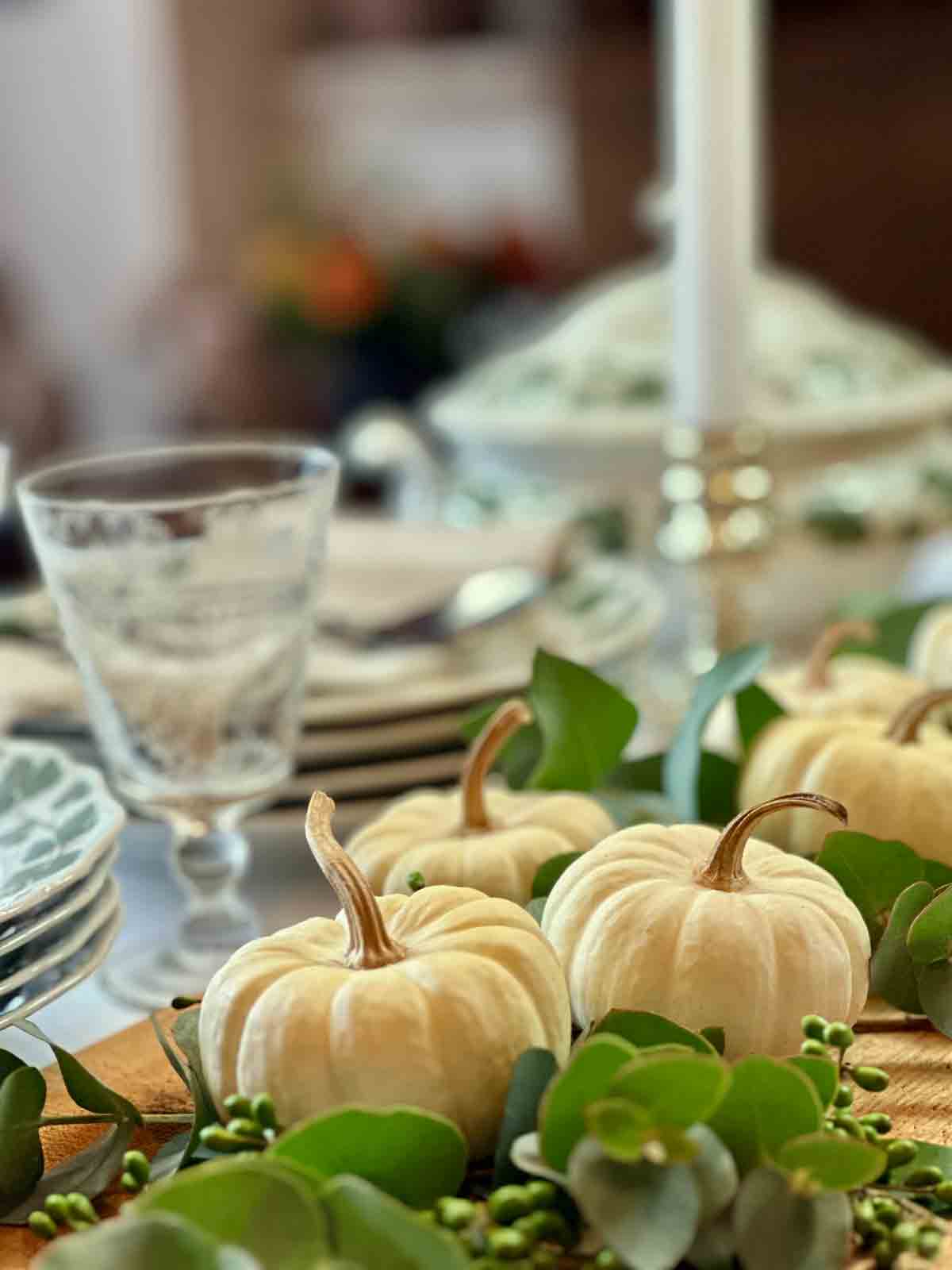 Tischdeko mit weißen Mini Kürbissen
