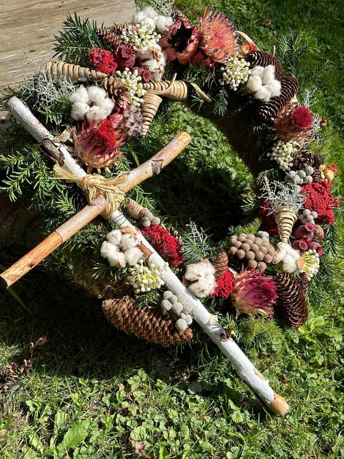 Mein Kranz besteht aus einem Strohrömer mit einem Durchmesser von 50 cm. Zuerst wird der Rohling mit Moos bedeckt, den ich mit einem feinen Blumendraht befestigt habe. Dann werden Tannenzweige und Koniferen aufgelegt und mit Patenthaften befestigt. Mit Tannenzapfen, getrockneten Blumen wie Schafgarbe und Protea, Stacheldraht Zweige, Baumwollblüten und weißen Beeren habe ich den Kranz geschmückt. Der eigentliche Hingucker ist das Kreuz aus dünnen Birkenästen auf der linken Seite. Der Kranz lässt sich sehr gut selbst machen und hält sich sehr lange. Im Gartencenter werden für kleine Gestecke schon mal 30 Euro verlangt und bei großen Gestecken oder Kränzen bekommt man unter 100 Euro so gut wie nichts. Die Kosten für meinen Kranz waren 45 Euro für das Material und „Selbermachen“ macht nicht nur Spaß, sondern kreative Arbeit liegt voll im Trend.