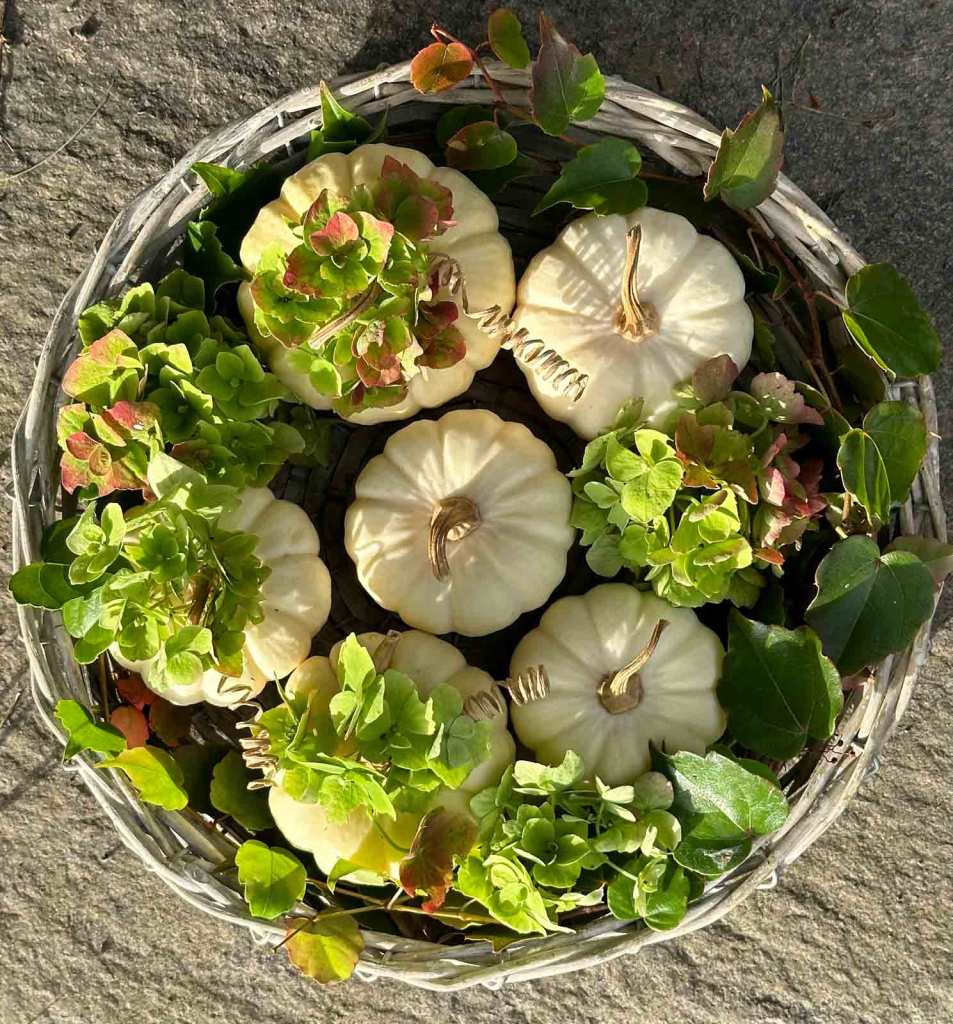 Klein, aber oho – das sind die handlichen Baby Boo Zierkürbisse die sich perfekt für die Dekoration im Herbst eignen. Ob in Schalen, Gestecken oder einfach pur, die kleinen Charmeuren ziehen alle Blicke auf sich. Für meine herbstliche Tischdekoration habe ich die weißen Kürbisse in eine Korbschale gesetzt und mit Hortensien und Weinlaub aus dem Garten geschmückt. Hortensien gehören zu den schönsten Sommerblumen und verzaubern im Herbst mit ihren gefärbten Dolden. Sie färben sich zunächst in ein Blassgrün, das bei den meisten Sorten im Oktober in rötliche Töne übergeht. Ich finde, dass Kürbis und Hortensien ein gutes Gespann sind und optimal miteinander Harmonieren.