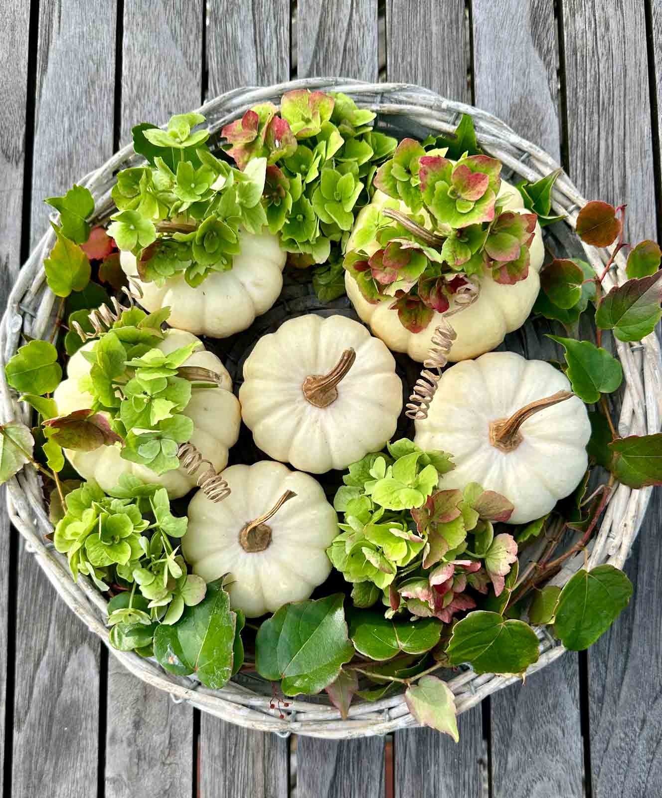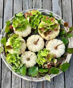Tischdeko mit Kürbis und Hortensien