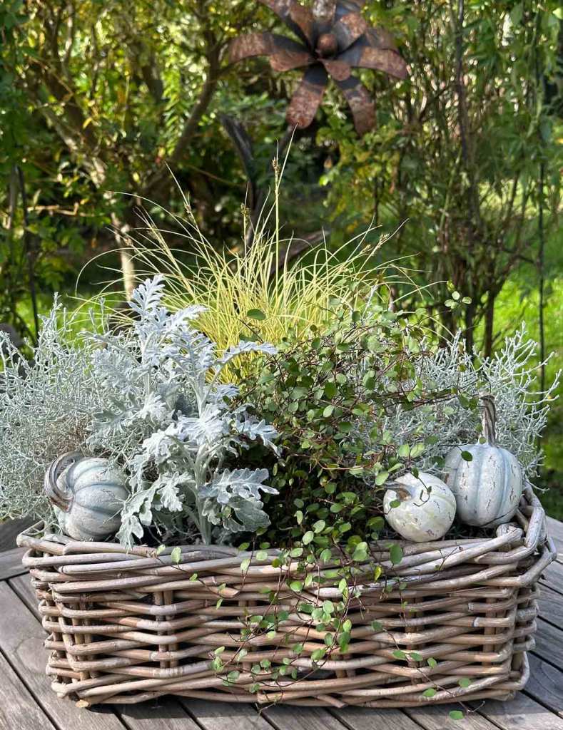 Das Silberblatt ist als Strukturpflanze, aufgrund der interessanten Blattfarbe und der geringen Ansprüche an Pflege im Herbst sehr beliebt. Ich mag die Kombination Silber und Grün sehr gerne und habe einen Korb mit Silberblatt, der Stacheldrahtpflanze, Gräser und Mühlenbeckia bepflanzt. Doch auch mit Heidekraut, Astern oder Chrysanthemen wird das Silberblatt gerne kombiniert.