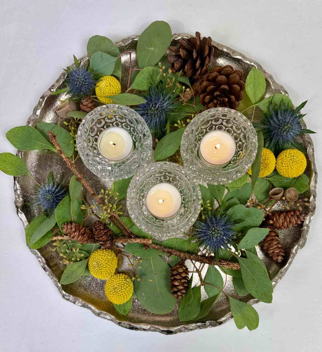 Für meinen Esstisch habe ich ein Tablett mit Eukalyptus Populus mit Beeren ausgelegt. Dazu kommen Craspedia, Disteln, ein Lärchenzweig und Zapfen in verschiedenen Größen und die Windlichter aus Glas sorgen für eine einladende und gemütliche Stimmung. Draußen pfeift der Wind, es ist eisig kalt und ich werde mir schon beim Frühstück die Kerzen anzünden. Ob ich heute vor die Türe gehe – wer weiß!