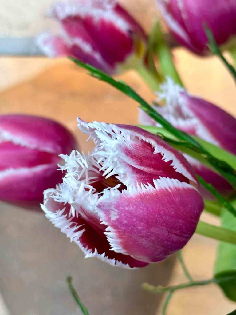 Für meinen ersten Tulpenstrauß habe ich mir gefranste Tulpen ausgesucht. Sie sind eine besondere Art von Tulpen mit krausen und gefransten Blütenblätter. Gefranste Tulpen, so manchem Tulpen-Liebhaber auch unter dem Namen Crispa bekannt, heben sich durch ihr einzigartiges Aussehen von allen anderen Tulpen Sorten ab. Jedes Blütenblatt ist ein kleines Kunstwerk für sich! Diese Tulpe verlangt durch ihre üppigen Blüten kein zusätzliches grünes Beiwerk. Für die Stabilität habe ich nur ein paar Zweige Heidelbeergrün in den Strauß eingearbeitet. Beim Kauf von Tulpen sollte die Blütenfarbe bereits erkennbar sein. Ist dies nicht der Fall so werden sich die Tulpen oft nicht mehr öffnen. Die Blätter und Stiele sollte sich fest und knackig anfühlen und je mehr sie „quietschen“, desto frischer ist die Tulpe. Bei guter Pflege hält ein Tulpenstrauß in der Regel 8 bis 10 Tage und ich bin mir sicher, dass dies nicht der letzte Tulpenstrauß ist.