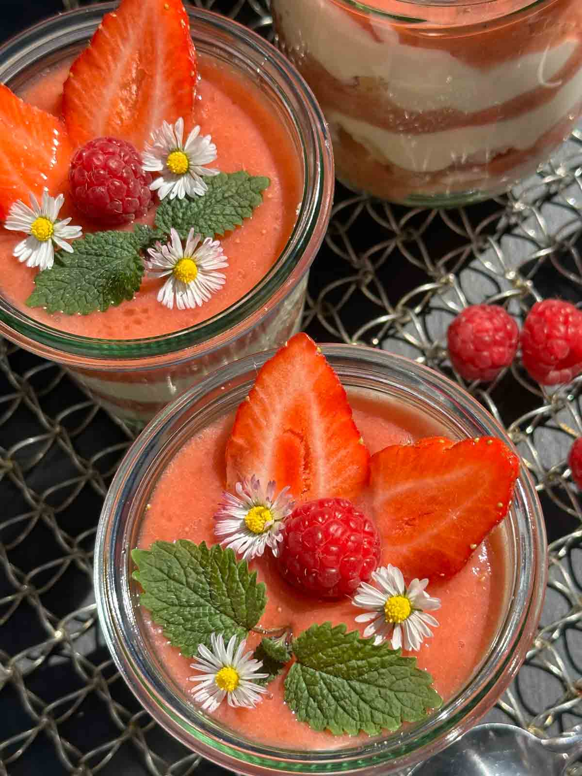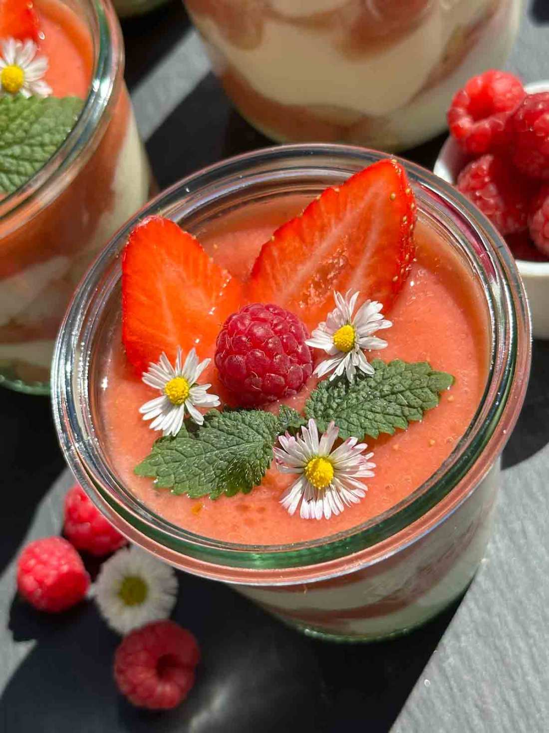 Rhabarber waschen, schälen und in ca. 2 cm große Stücke schneiden. Zucker, Zitronensaft und Wasser zusammen mit den Rhabarber Stücke in einen Topf geben und für ca. 8 bis 10 Minuten bei schwacher Hitze kochen lassen. Die gewaschenen, in Stücke geschnittene Erdbeeren hinzugeben und weitere 3–4 Minuten köcheln lassen. Beiseite stellen und abkühlen lassen. Das Kompott mit den Himbeeren grob pürieren. Für die Creme, Mascarpone, Quark und das Mark der Vanilleschote in einer Schüssel verrühren. Die Schlagsahne steif schlagen und unter die Crememasse vorsichtig unterheben. Nach Bedarf etwas süßen. Löffelbiskuit (ich habe ungezuckerte verwendet) in Stücke schneiden und in die Gläser verteilen. Abwechselnd Löffelbiskuit, Creme und Rhabarber-Erdbeer Kompott darauf und so lange wiederholen bis die Gläser voll sind. Mit frischen Erdbeerstücken, Minzblätter und wer mag mit Gänseblümchen garnieren. Guten Appetit.